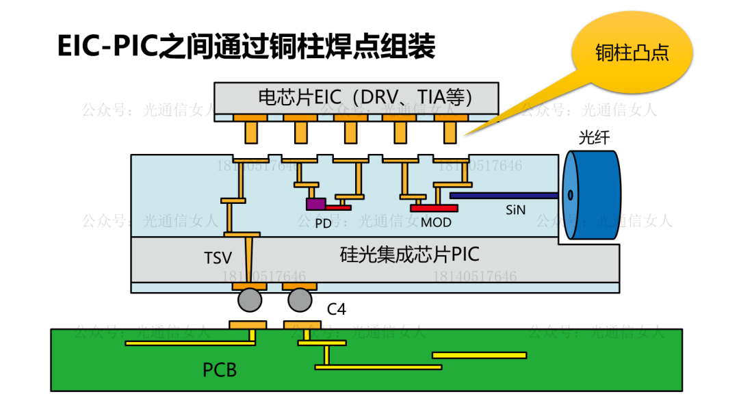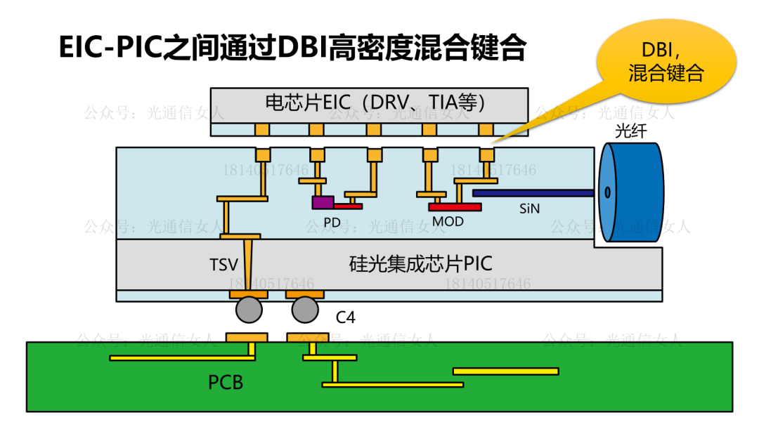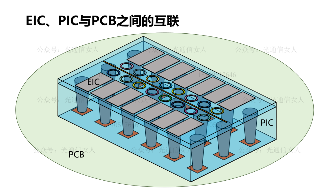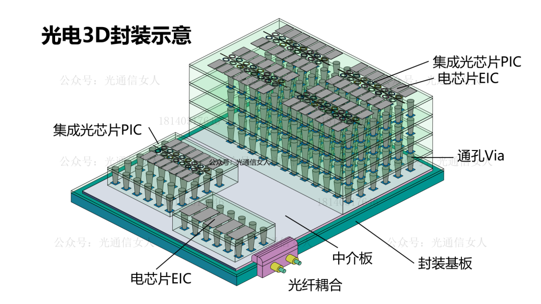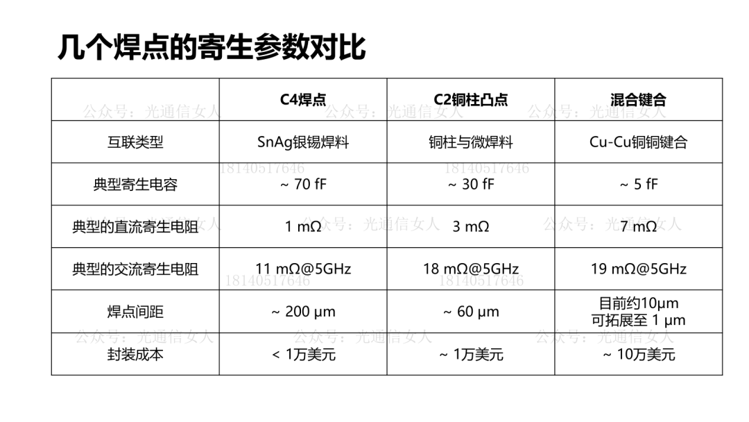现在的硅光芯片3D封装,电芯片EIC与硅光芯片PIC“叠摞”焊接,C4凸点、铜柱C2凸点或者是混合键合,UCdavis大学做了焊点工艺与寄生参数的分析,以及与灵敏度的关系。之前他家就分析这些内容,Y9T161 硅光芯片与电芯片采用DBI或C4高密度大带宽互联可以通过C4焊点来连接EIC与PIC,焊点间距在150-200μm,硅光芯片与PCB可以采用键合金丝互联。一个立体示意图如下所以,EIC与PIC之间焊点的寄生电容约70fF,如果是接收端,硅光芯片的PD例如为9fF,到TIA放大器的输入电容为14fF,而EIC芯片之间的C4焊点电容如果为70fF, 整体输入总电容接近100fF,会导致带宽受限,导致高频信号的衰减,劣化灵敏度。产业也在不断的优化C4焊点向小型化路径演进,但由于焊料的高温熔融塌陷,其总体的焊点间距是受限的。另一种更小型化的方式是采用铜柱凸点工艺。焊料采用银锡的话,铜的熔融温度高于锡基焊料,铜柱支持焊点间距进一步缩小。而采用混合键合工艺,则大幅度降低引脚间距,提高带宽,以及优化灵敏度。采用铜柱焊点的工艺可如下示意图。硅光芯片与PCB也可以将键合金丝优化为TSV的硅通孔。~~,TSV是一种硅光芯片的衬底通孔,有些公司则是用其他孔,如博通、台积电用的是扇出的绝缘介质孔,不是硅通孔。回到EIC与PIC的工艺,C4焊点以及铜柱凸点,铜铜键合的工艺,其寄生电容差异很大。采用混合键合工艺替代C4,其中C4封装引起的70fF电容就可以降低为5fF,其他电容不变,仅仅优化封装工艺,就可以得到6dB的性能提升。采用混合键合,是高密度封装工艺,也称之为DBI。先进封装的成本也会增大。UC davis大学给出一个未来的光电3D封装的示意图。采用更多阶的高密度3D封装,提高线路密度,优化性能。4月11日,《人工智能AI大算力驱动的高速光模块/引擎发展趋势》,三个小时,可详询18140517646