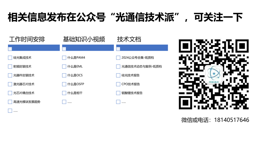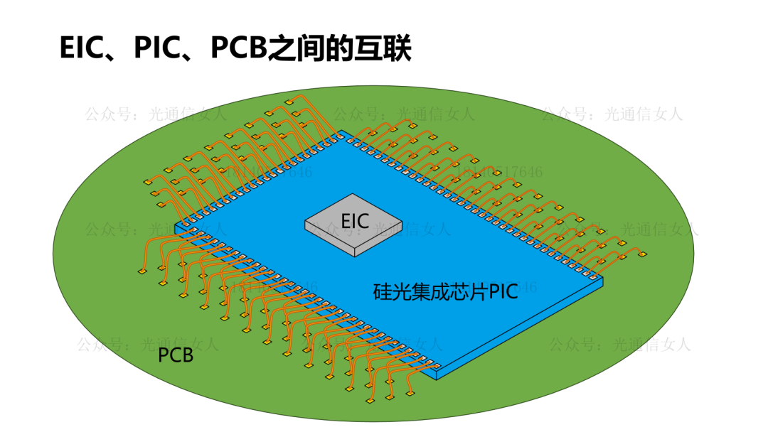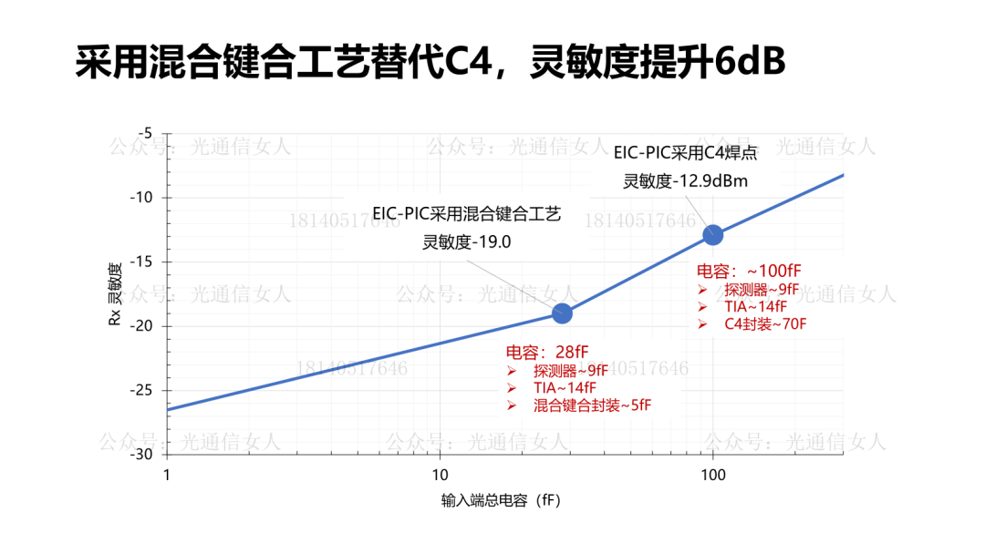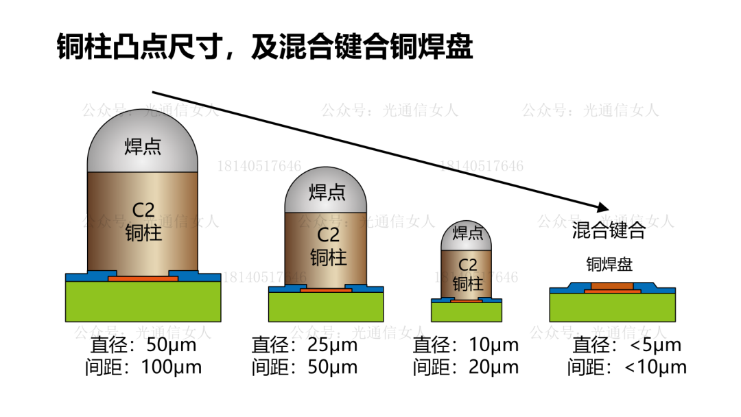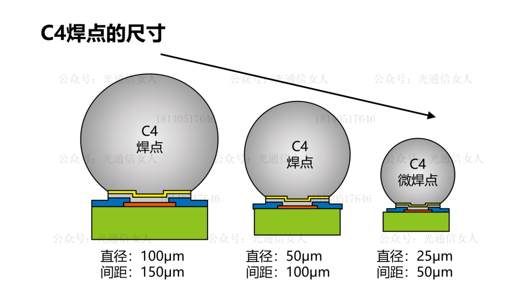 现在的硅光芯片3D封装,电芯片EIC与硅光芯片PIC“叠摞”焊接,C4凸点、铜柱C2凸点或者是混合键合,UCdavis大学做了焊点工艺与寄生参数的分析,以及与灵敏度的关系。之前他家就分析这些内容,Y9T161 硅光芯片与电芯片采用DBI或C4高密度大带宽互联可以通过C4焊点来连接EIC与PIC,焊点间距在150-200μm,硅光芯片与PCB可以采用键合金丝互联。一个立体示意图如下所以,EIC与PIC之间焊点的寄生电容约70fF,如果是接收端,硅光芯片的PD例如为9fF,到TIA放大器的输入电容为14fF,而EIC芯片之间的C4焊点电容如果为70fF, 整体输入总电容接近100fF,会导致带宽受限,导致高频信号的衰减,劣化灵敏度。产业也在不断的优化C4焊点向小型化路径演进,但由于焊料的高温熔融塌陷,其总体的焊点间距是受限的。另一种更小型化的方式是采用铜柱凸点工艺。焊料采用银锡的话,铜的熔融温度高于锡基焊料,铜柱支持焊点间距进一步缩小。而采用混合键合工艺,则大幅度降低引脚间距,提高带宽,以及优化灵敏度。采用铜柱焊点的工艺可如下示意图。硅光芯片与PCB也可以将键合金丝优化为TSV的硅通孔。~~,TSV是一种硅光芯片的衬底通孔,有些公司则是用其他孔,如博通、台积电用的是扇出的绝缘介质孔,不是硅通孔。回到EIC与PIC的工艺,C4焊点以及铜柱凸点,铜铜键合的工艺,其寄生电容差异很大。采用混合键合工艺替代C4,其中C4封装引起的70fF电容就可以降低为5fF,其他电容不变,仅仅优化封装工艺,就可以得到6dB的性能提升。采用混合键合,是高密度封装工艺,也称之为DBI。先进封装的成本也会增大。UC davis大学给出一个未来的光电3D封装的示意图。采用更多阶的高密度3D封装,提高线路密度,优化性能。4月11日,《人工智能AI大算力驱动的高速光模块/引擎发展趋势》,三个小时,可详询18140517646