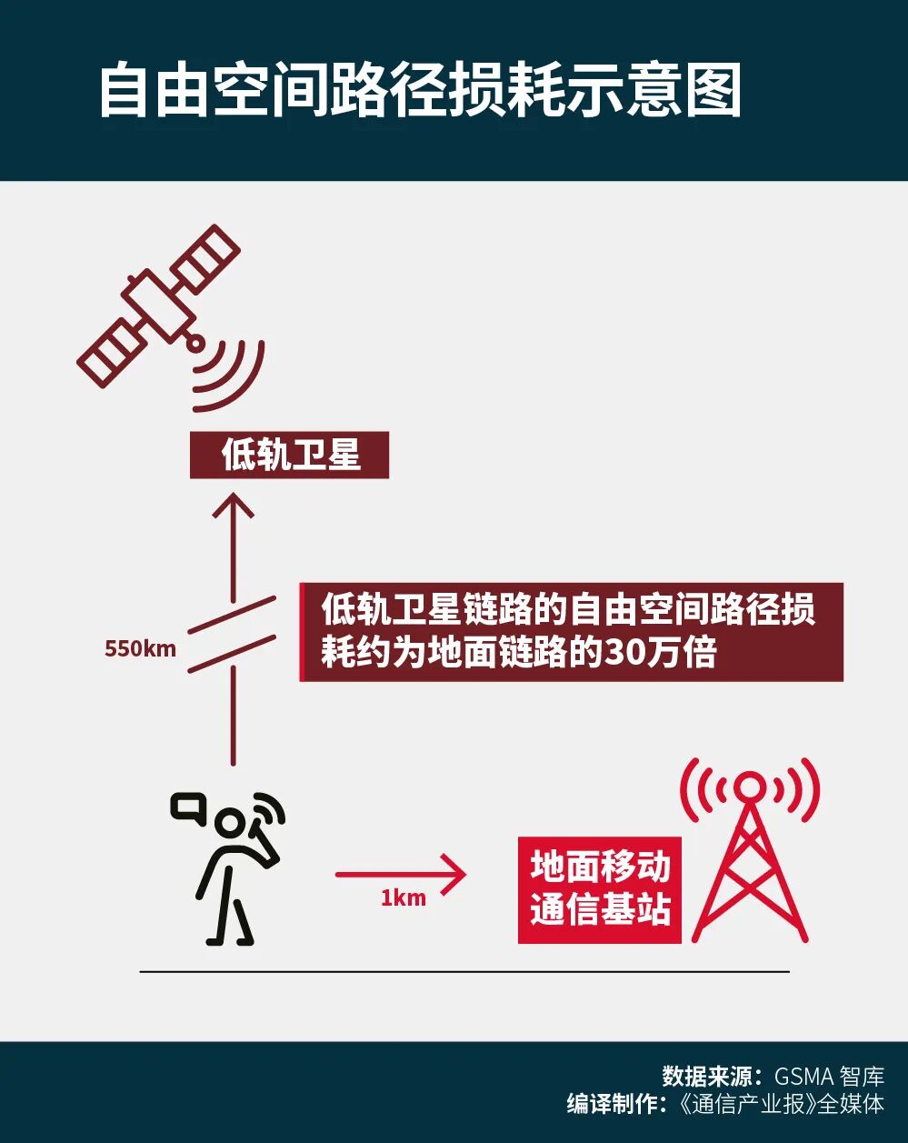 例如,假设用户手持智能手机,与最近的地面基站相距1千米,与卫星相距550千米,那么卫星信号需要克服的损耗,约为地面基站信号的30万倍。即便卫星部署在约330千米高度的甚低地球轨道,其信号的自由空间路径损耗,仍比1千米外的地面基站高约11万倍。