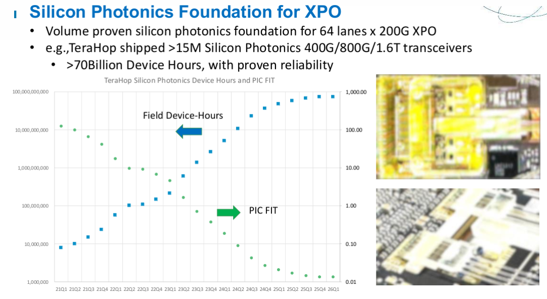 一是复用成熟硅光子平台,硅光子技术方案仍将是XPO的核心基础,当前12.8T XPO基于8x200G的硅光芯片构建,TeraHop在过去两年已累计出货硅光模块一千五百多万,700亿器件-小时,达到极低的失效率,为高通道数硅光产品如XPO打下坚实基础。