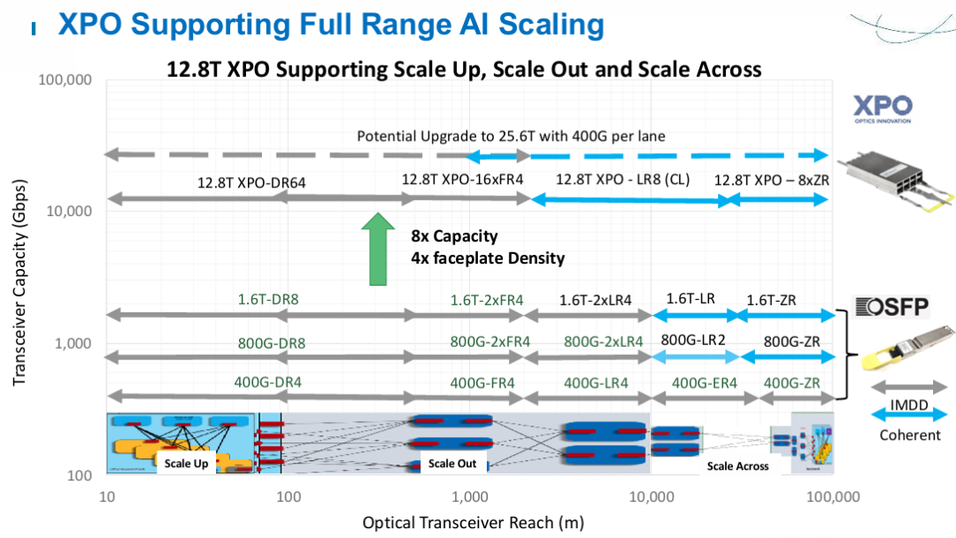 从行业背景来看,AI超算与大规模数据中心的快速发展,对光互连提出了更为刚性的要求:一方面单xPU带宽已逼近10Tbps,交换机向 100T/200T持续演进,另一方面,系统仍面临面板密度受限、高功耗、散热压力大等现实挑战。同时,互连需求需覆盖100米至80公里的多样化传输场景,并兼顾快速量产与易维护能力。在此背景下,传统OSFP等方案难以满足。针对这些行业痛点,由行业领袖企业主导创设XPO MSA,提出了系统性解决方案,本次Webinar四家参与厂商是XPO MSA创始成员及协议共同主席。