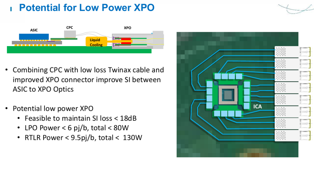 二是低功耗XPO的潜力: 通过将CPC技术与低损耗双轴铜缆、改进的XPO连接器相结合,可优化ASIC与XPO光模块之间的信号完整性,有望实现低功耗目标,即LPO功耗低于6pj/b,总功耗低于80W;RTLR功耗低于9.5pj/b,总功耗低于130W,为AI设备的低功耗运行提供有力支撑。