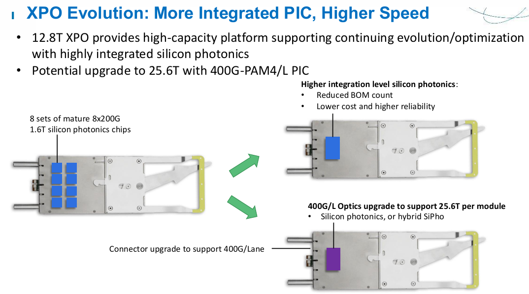 三是XPO有清晰演进路线: 通过硅光高度集成,进一步降低成本,提升可靠性。硅光或混合硅光集成芯片速度提升到400G-PAM4/L,同时配合连接器升级,XPO可提升至25.6T容量。
