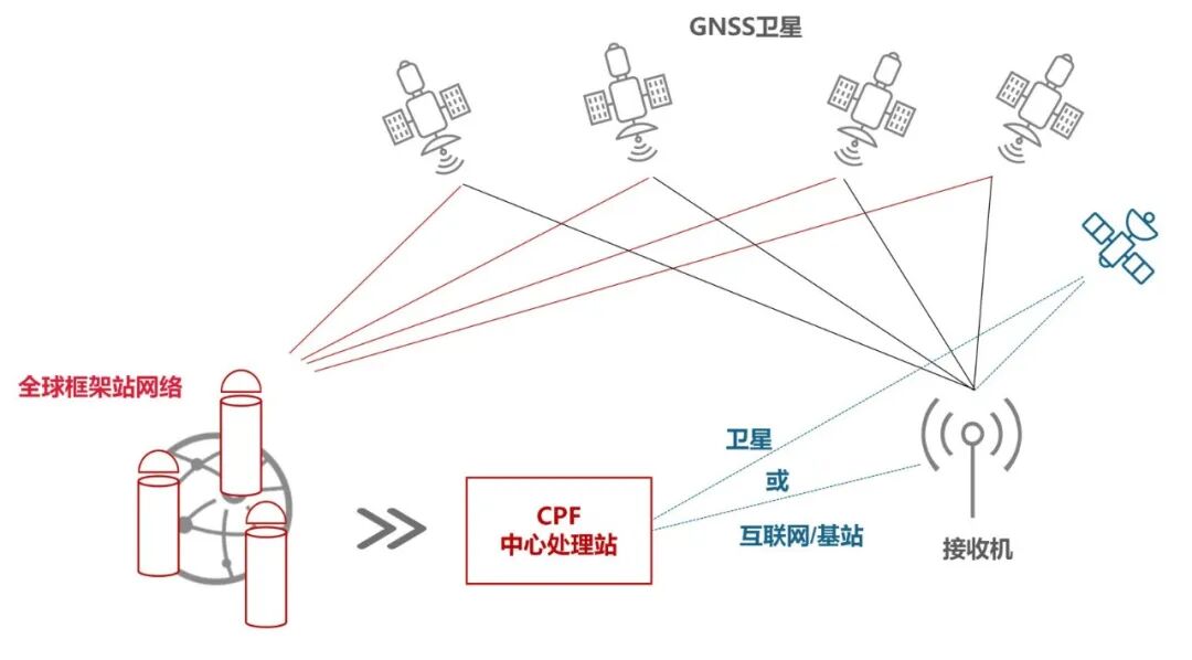 通过几百个全球框架站,汇总到中心处理站(CPF)来建模修正精密卫星轨道、卫星钟差等误差源。