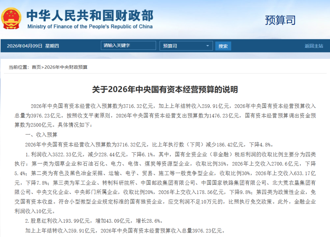 近日,财政部发布《2026年中央财政预算》及配套文件《关于2026年中央国有资本经营预算的说明》,明确了2026年国有全资企业(非金融)税后利润的收取比例。其中,电信、石油石化、电力等企业成为本次调整的重点对象,上缴比例由2025年的20%上调至35%,与烟草企业一同纳入最高档位。