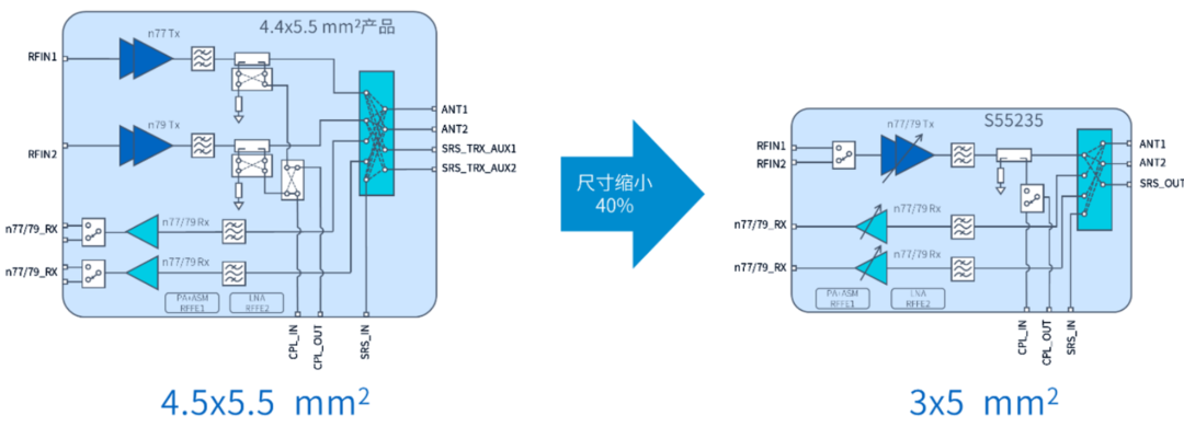 图:S55235在原有高集成5G UHB双频1T2R L-PAMiF基础上,尺寸再缩小40%