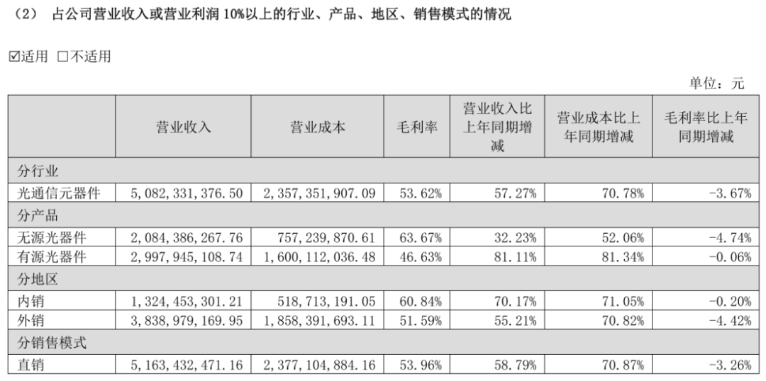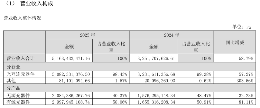 其中,有源光器件业务实现收入29.97亿元,同比增长81.11%,占营收的比重提升7.15个百分点至58.06%。天孚通信解释称,有源业务的增长主要来源于高速率有源产品的增加交付。无源光器件业务则实现收入20.84亿元,同比增长32.23%,占营收的比例为40.37%。