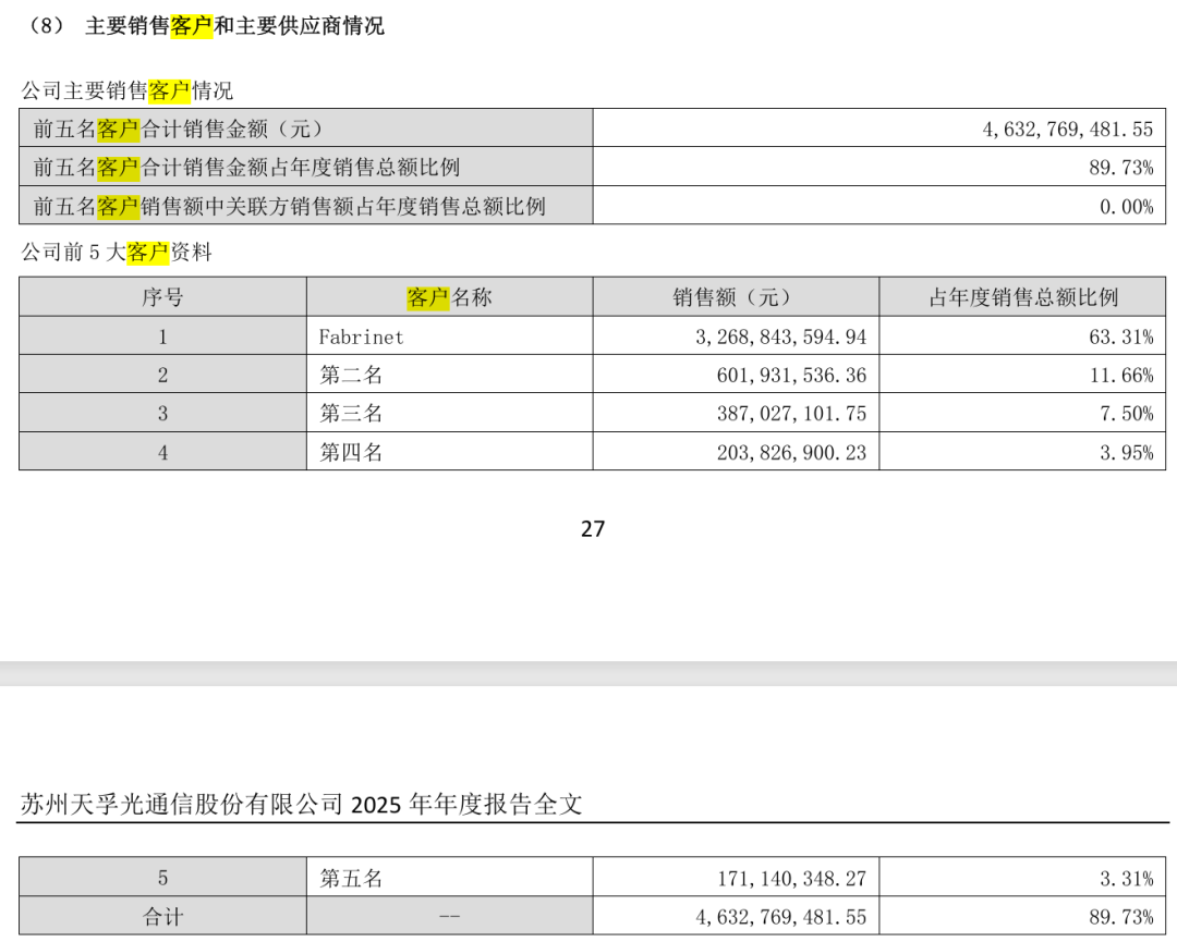 尽管业绩实现高速增长,天孚通信在报告期内也呈现出客户集中度较高的特征。公司前五大客户销售收入合计占总营收比例达到89.73%,较 2024 年的86.80%有所提升。其中,第一大客户Fabrinet贡献销售额32.68亿元,占总营收比重达63.31%,较2024年的61.69%同样进一步上升。