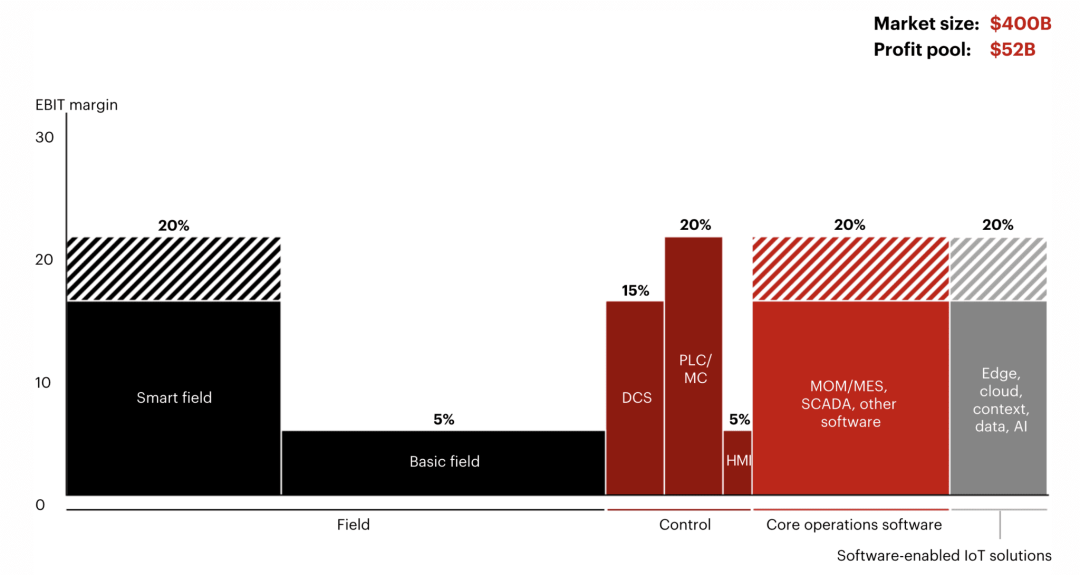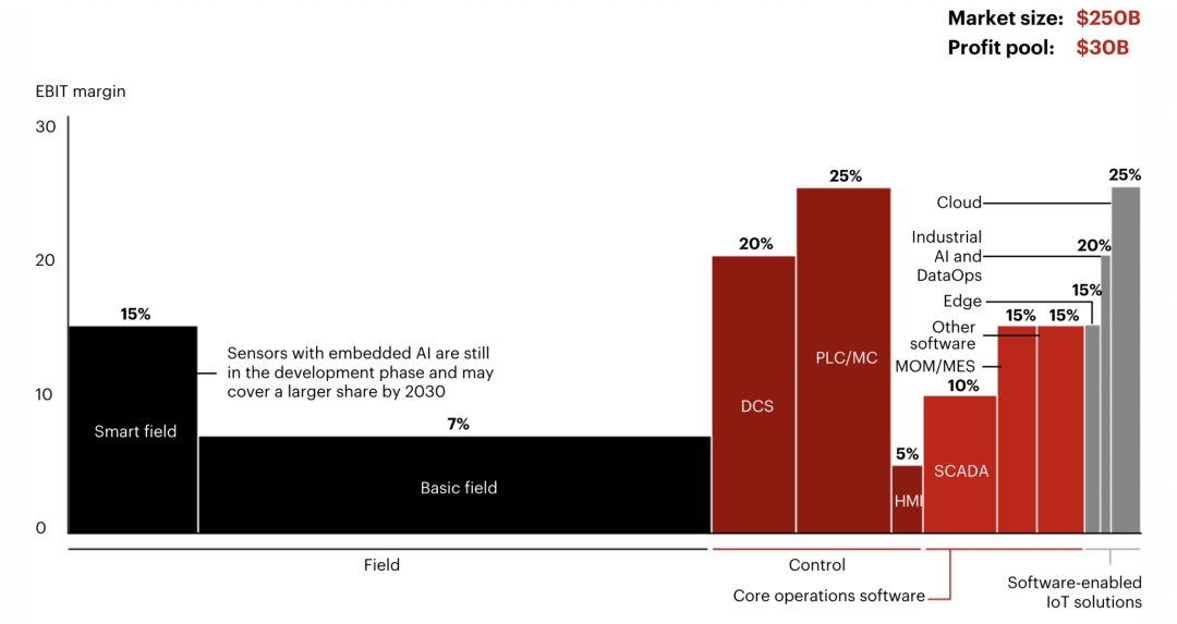 根据贝恩咨询的分析,到本十年末,预计超过 80% 的行业利润池(企业投资/供应商利润)将集中在沙漏的两端,其中,以软件和数据驱动为核心的上层将贡献超过一半的行业总利润,而智能现场设备则将进一步占据约 25% 至 30% 的份额,如下图所示:
