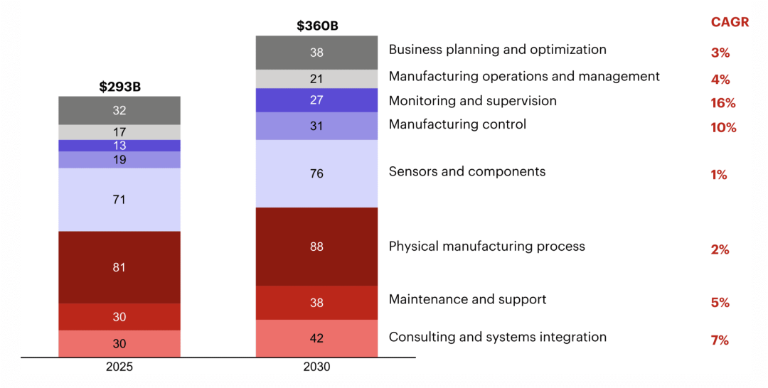 此外,报告还提出了另一项预测,到 2030 年,近一半的行业收入将依赖基于人工智能的解决方案,这进一步凸显了价值正向“智能”迁移。根据《2026 年工业自动化高管调研》(见下图),仅 AI 驱动的解决方案,到 2030 年就有望释放高达 700 亿美元的新增市场价值。