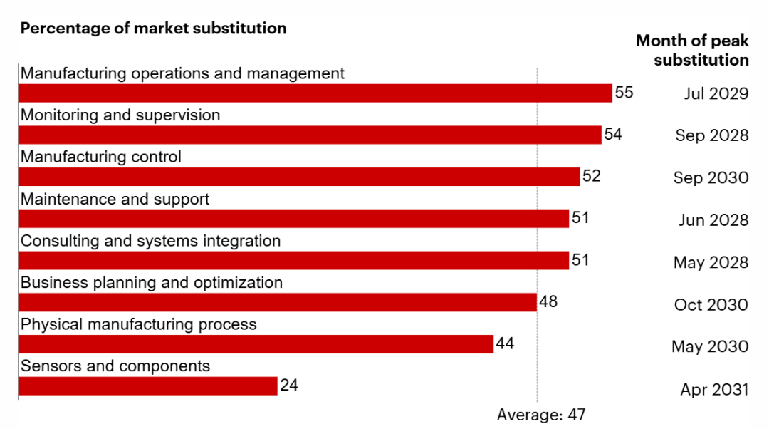 “替代高峰”预计出现在 2028 年中后期(咨询和集成、维护和支持、监控和管理),2029 年中期(制造运营),以及 2030 年中后期(实体制造、制造控制、业务优化),而物联网相关传感器和组件的普及预计将在 2031 年中期实现。