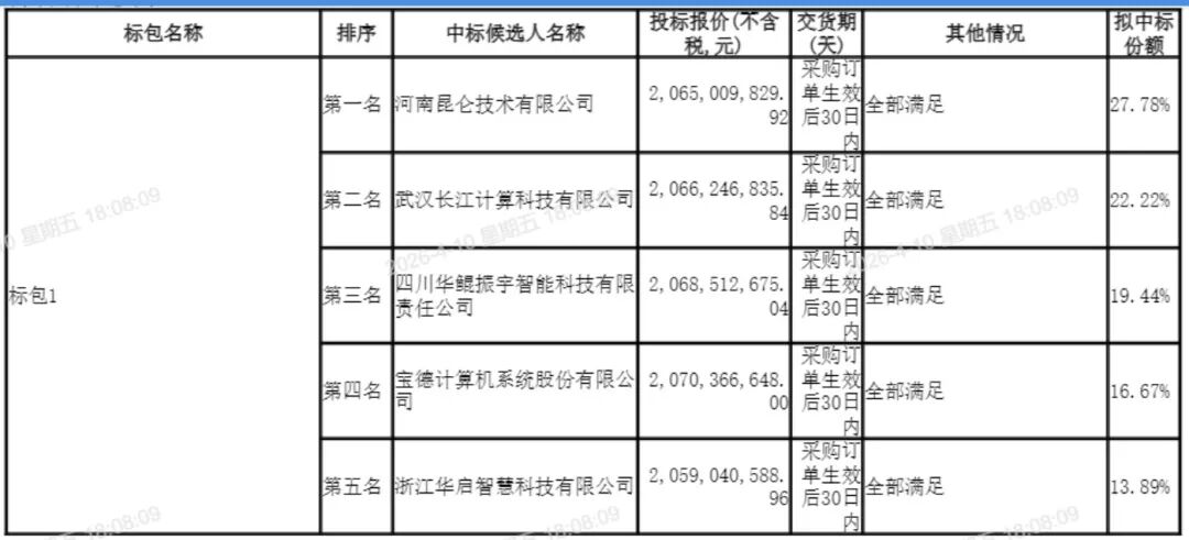 经评审,五家企业成功入围并确定拟中标份额:河南昆仑技术有限公司以20.65亿元的投标报价位列第一,拟中标份额27.78%;武汉长江计算科技有限公司以20.66亿元报价位列第二,拟中标份额22.22%;四川华鲲振宇智能科技有限责任公司以20.69亿元报价位列第三,拟中标份额19.44%;宝德计算机系统股份有限公司以20.70亿元报价位列第四,拟中标份额16.67%;浙江华启智慧科技有限公司以20.59亿元报价位列第五,拟中标份额13.89%。