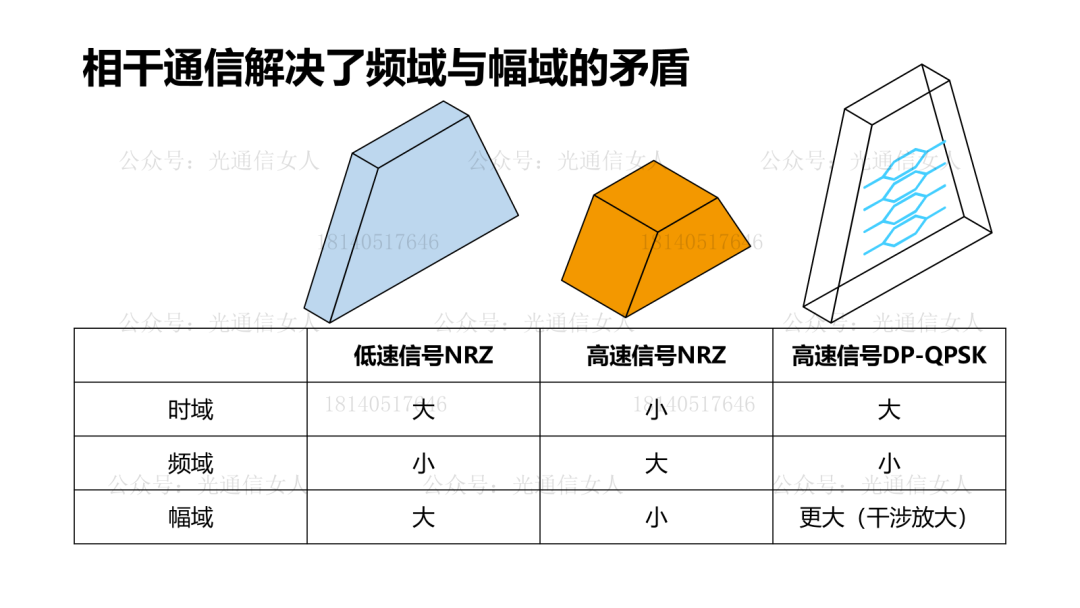 相干通信大约在2012年进入产业化时代。要解决的最重要的问题就是接收端的灵敏度劣化的事儿。通信有个规律,(调制格式、传输距离、发射功率等其他前提不变),提高带宽,提高信号的调制速率,接收端的灵敏度就会劣化。原因是,提高带宽,信号在频域拉宽,导致信号幅度降低,SNR信噪比的Signal 高度降低,灵敏度收到的信号很难识别,误码增多,灵敏度劣化。简单理解这个规律,就是同样的一公斤的信号,当速率提高时,信号增厚,高度降低,导致这个只能识别高度来判断信号接收端经常会出现“误判”。第一个方向,高速信号增大功率,就是把高速信号“增重”,保持厚度,强行增加高度。这个现象在以太网、PON、无线基站等等领域都能看到。同样的数据中心2km传输,400Gbps的Tx发射端功率更大,40Gbps的Tx发射端功率较低。 同样的PON 20km的传输,10GPON的Tx功率比2.5G PON更大,50GPON的功率更大。高速信号增大功率,如果大到一定程度会激发光纤的非线性效应,信号是有“限高”,和高速公路的货车限高的原理类似。第二个方向,让接收端多一个识别域,可以识别幅域,也可以识别频域(相位的识别是频域技术),需要掌握信号的“相位控制技术”第三个方向,在接收端放大信号,可以通过干涉放大,在接收端来控制“相位”通过相互干涉,放大信号的“高度”。 这也需要“相位控制技术”第四个方向,改变调制格式,只增大速率,但打破原来的提速就得扩频的魔咒,不让频域增加,信号的高度也不用降低了。这需要相位正交技术,也需要“相位控制”1995-2010年,长途干线通信是DWDM波分复用的NRZ格式的信号。2012年后,长途干线就成了DWDM波分复用的DP-QPSK,并后续引入DP-16QAM。相干通信,通过有效掌握相位控制技术,实现了接收端“相干”放大提升信噪比的作用,实现了接收端幅域与频域的识别,实现了发射端相位正交的IQ调制技术,...., 解决了传统NRZ格式强度调制直接检测IMDD方式技术发展所产生的频域与幅域的矛盾。周六聊一下相干通信的发展趋势。可详询18140517646