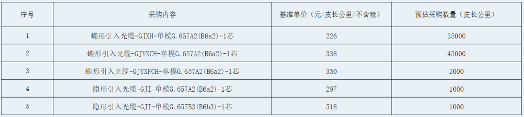 招标人为【中国电信股份有限公司新疆分公司、中国电信集团有限公司新疆分公司】 项目概况:本项目采购估算金额2464万元(不含税)。 招标内容:2026年新疆电信应急引入光缆集约采购,采购内容包括:蝶形引入光缆-GJXH-单模G.657A2(B6a2)-1芯、蝶形引入光缆-GJYXCH-单模G.657A2(B6a2)-1芯、蝶形引入光缆-GJYXFCH-单模G.657A2(B6a2)-1芯、隐形引入光缆-GJI-单模G.657A2(B6a2)-1芯、隐形引入光缆-GJI-单模G.657B3(B6b3)-1芯。详细采购内容详见下表: