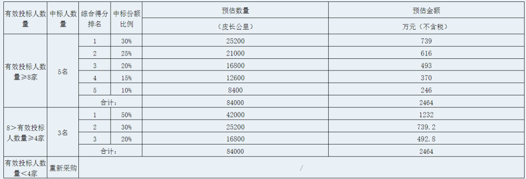 框架实施周期:自框架协议生效之日起12个月。 交货期:接到招标人采购订单之日起15个工作日内供货到甲方指定地点。 标段划分及中标情况:本项目不划分标段,中标人不允许转包、违法分包。中标份额数量根据有效投标人数量进行划分,按照综合得分由高至低的顺序依次推荐每个份额的中标候选人,份额划分情况详见下表: