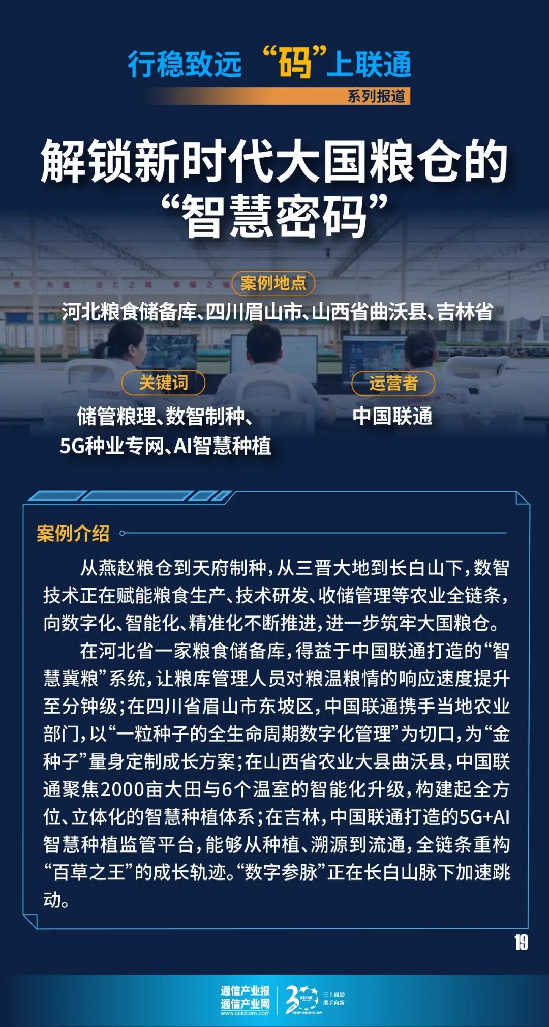 粮安天下。 “保障国家粮食安全是一个永恒课题,任何时候这根弦都不能松。”在北方,储备粮存储年限为3至5年。如何让粮食在数年的储存周期中安全如初?答案是:打造一个近乎“恒温休眠舱”般的粮库环境,通过“控温、控湿、控气、防虫”一整套技术体系,让粮库环境成为守护粮食安全的坚实“压舱石”。这就给粮库管理者提出了要求。“过去我们每天要爬仓测温4次,扛着测温杆在40℃的仓房里钻进钻出,汗珠子能浇透半身衣裳。”在河北省一家粮食储备库监控室内,管理员在手机屏幕上盯着智慧粮库系统的“三维一体”数字化平台说道,“现在手机就是我的‘千里眼’,哪层粮温异常,哪个摄像头有异动,指尖一点全知道。”得益于中国联通打造的“智慧冀粮”系统,通过物联网、大数据、AI智能分析等技术,让粮库管理人员对粮温粮情的响应速度提升至分钟级,大大提升了粮库管理效率。工作人员从左图蓝色楼梯走上二楼,脚下踩着的是7米多高的小麦储粮。在这个粮食储备库的粮堆深处,数百个神经末梢般的智能传感器正在24小时值守,将粮仓数据实时汇聚到三维一体可视化平台。在“智慧冀粮”系统的粮仓界面,大气温湿度、仓房温湿度以及三百多个不同点位的粮温数据实时显示,视频监控可随时查看仓内任意角落。当某一区域粮温突破临界值时,系统会自动触发“数字警报”,提前预警霉变风险。而且,在智能通风控制系统支持下,可以自动计算最佳通风时机,精准计算出的通风方案让每度电都用在“刀刃”上。藏粮于地,藏粮于技。中国联通打造的购销监管、远程巡查等“互联网+监管”功能,涵盖粮食收购入库、在库储存、销售出库的全链条监管,助力粮食储备实现省、市、县“穿透式”高效监管,使出入库把关不严、以陈顶新、账实不符等传统手段难以监管到位的问题无所遁形。