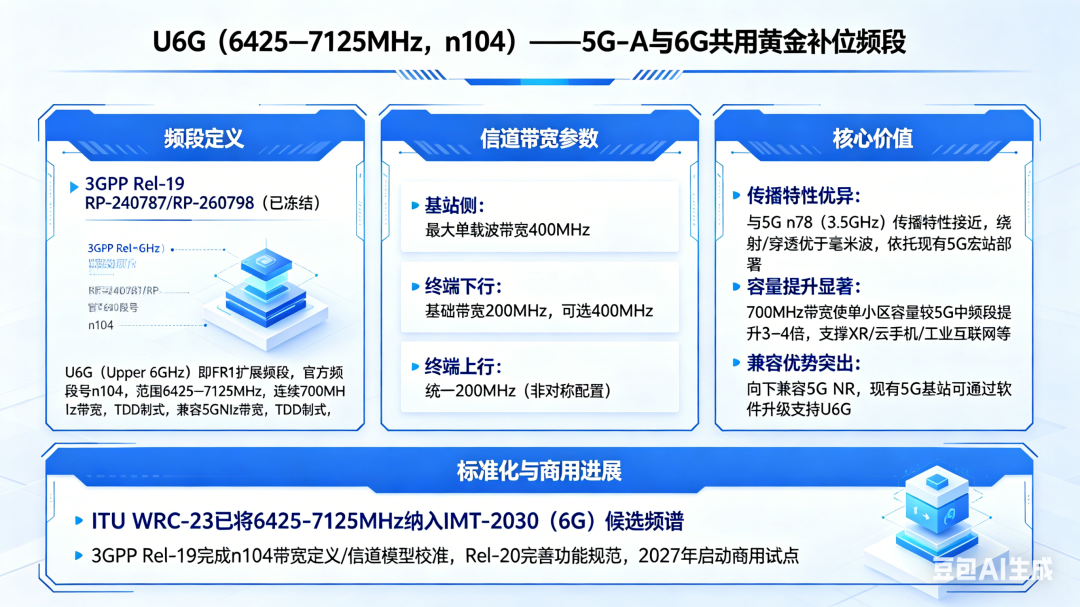 U6G(Upper 6GHz)即FR1扩展频段,官方频段号为n104,频段范围明确界定为6425–7125MHz,拥有连续700MHz的超大带宽。需要明确的是,该频段并非6G专属新增,核心定位是5G-Advanced(Rel-19)与6G共用频段,采用TDD制式,完全兼容5G NR帧结构,可实现从5G到6G的平滑演进,大幅降低产业升级成本。基站侧:最大单载波带宽可达400MHz,支撑大容量传输需求;终端下行:基础带宽为200MHz,400MHz为可选高阶能力,适配不同终端等级需求;终端上行:统一采用200MHz带宽,为非对称配置,精准匹配实际业务的上下行流量差异。2. 核心价值