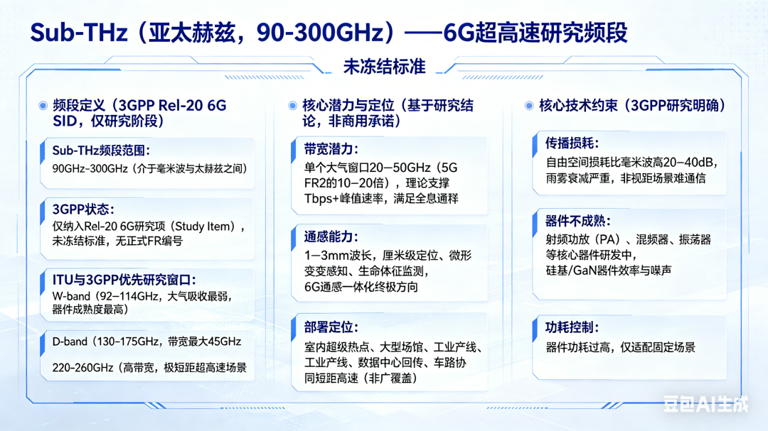 Sub-THz的核心价值在于其极致的带宽潜力,是6G实现Tbps级超高速传输的唯一可能,但目前仍处于研究阶段,其潜力需依托器件与技术突破才能逐步释放:带宽潜力突出:单个大气窗口带宽可达20–50GHz,是5G FR2频段的10–20倍,理论上可支撑1Tbps+峰值速率(修正此前“直接支持”的表述,明确为理论潜力),可满足全息通信、数字孪生、8K/16K实时渲染、数据中心无线互联等极致场景需求;通感能力极致:波长仅1–3mm,波束极窄,可实现厘米级定位、微形变感知、生命体征监测等功能,是6G通感一体化的终极研究方向;部署定位清晰:受限于技术约束,其部署场景明确为室内超级热点、大型场馆、工业产线、数据中心回传、车路协同短距高速等,不具备广覆盖能力,仅作为U6G、FR3的“容量补充极”。3. 核心技术约束(3GPP研究明确,无主观臆断)