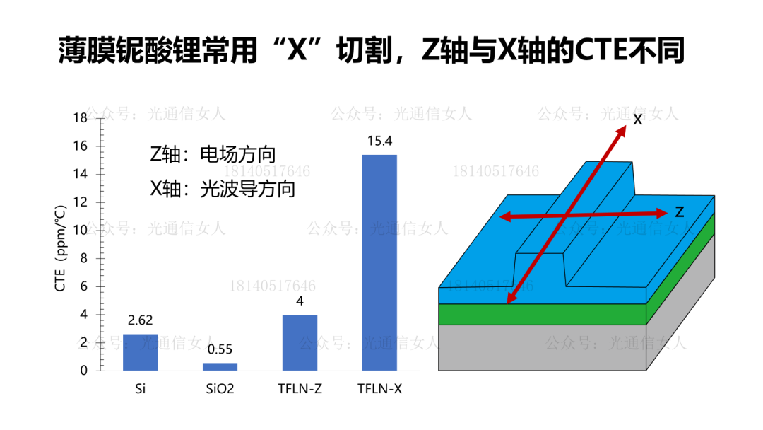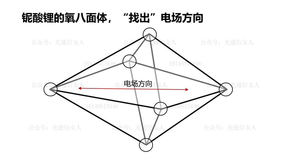 硅晶圆异质集成InP的开槽设计,主要是为了烘干,逸出水汽。薄膜铌酸锂波导的结构,可以是条形波导,脊型波导或者异质板型波导。板型波导的电场不容易设计,条形波导的刻蚀侧壁粗糙度会引起光学损耗,产业里常用的是脊型波导。TFLN选择脊型波导,还需要考虑电极的分布,可以是波导上方有电极,也可以是左右两侧的电极设计。波导上方电极,会引起金属的光吸收,产生损耗,左右电极设计是产业常见的选择。铌酸锂的泡克尔斯效应是与晶体取向相关的,电极之间的电场方向要位于铌酸锂晶体的“Z轴”,也就是氧八面体的上下锥尖的方向。铌酸锂是“氧”、“铌”、“锂”原子的组成,其中的氧原子呈现八面体结构,找出铌酸锂的晶体方向。设计电场。对于X切割方向的铌酸锂,波导X轴与电场的Z轴,二者的膨胀系数是不一样,且差异很大。波导需要高温退火来降低损耗,而温度的剧烈变化,在铌酸锂晶圆的各向异性结构里出现内部巨大的应力。波导两侧间隔开槽的目的是避免波导在退火时开裂失效,可有效提高可靠性。Y12T90 Ciena:TFLN的12.8T XPO 相干Lite光模块4月18日,《超大带宽相干通信与高波特率光模块发展趋势》,可详询18140517646