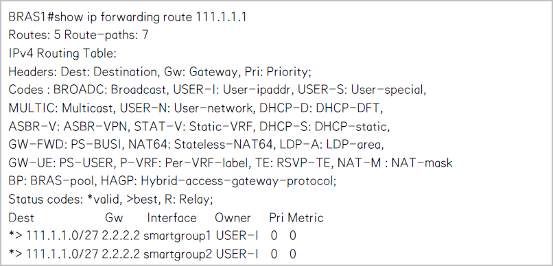 3. 在BRAS1上查看用户地址的路由表(为用户地址,为BRAS2的loopback地址),确认BRAS1 上存在gateway-redirect生成的网关重定向路由指向BRAS2,出接口为上行两台CR。