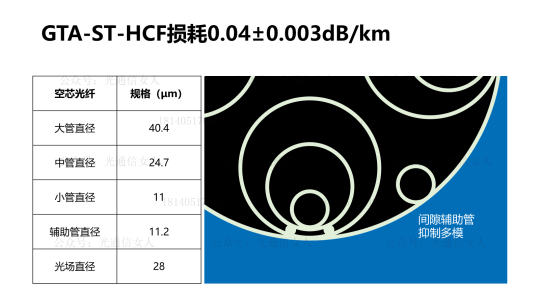 空芯光纤的标准化研究在ITU-T、CCSA等体系启动项目,华为也在IEEE提交空芯光纤用于AI组网的技术提案。2025年,长飞空芯光纤损耗从0.086dB/km降低到0.05dB/km,2026年进一步降低到0.04dB/km.2025年,中移动 长飞等国内产业链做了很多验证,长飞的几个数据2026年的空芯光纤Workshop提到的产业长距部署的一些状态。长飞2026年的0.04dB/km的超低损耗,是在2025年5元结构向四元结构的转换。2024年也写过微软从5元向4元分布转换,在不改变光场直径的前提下降低损耗。Y10T341 微软:用于数据中心与单模光纤适配的空芯光纤产业逐步从6元(或称为6阶),向5阶,4阶,逐步演进,目的是“不改变光场直径”前提下“扩大嵌套管直径”。但由于四元分布,管与管之间的间隙过大,也会激发高阶模,长飞采用“非等距”分布的间隙辅助管,抑制多模(高阶模)在管间被激发,有效保持单模低损耗特性。4月18日,《超大带宽相干通信与高波特率光模块发展趋势》,可详询18140517646