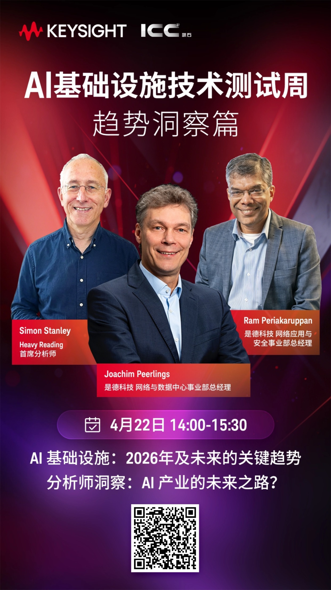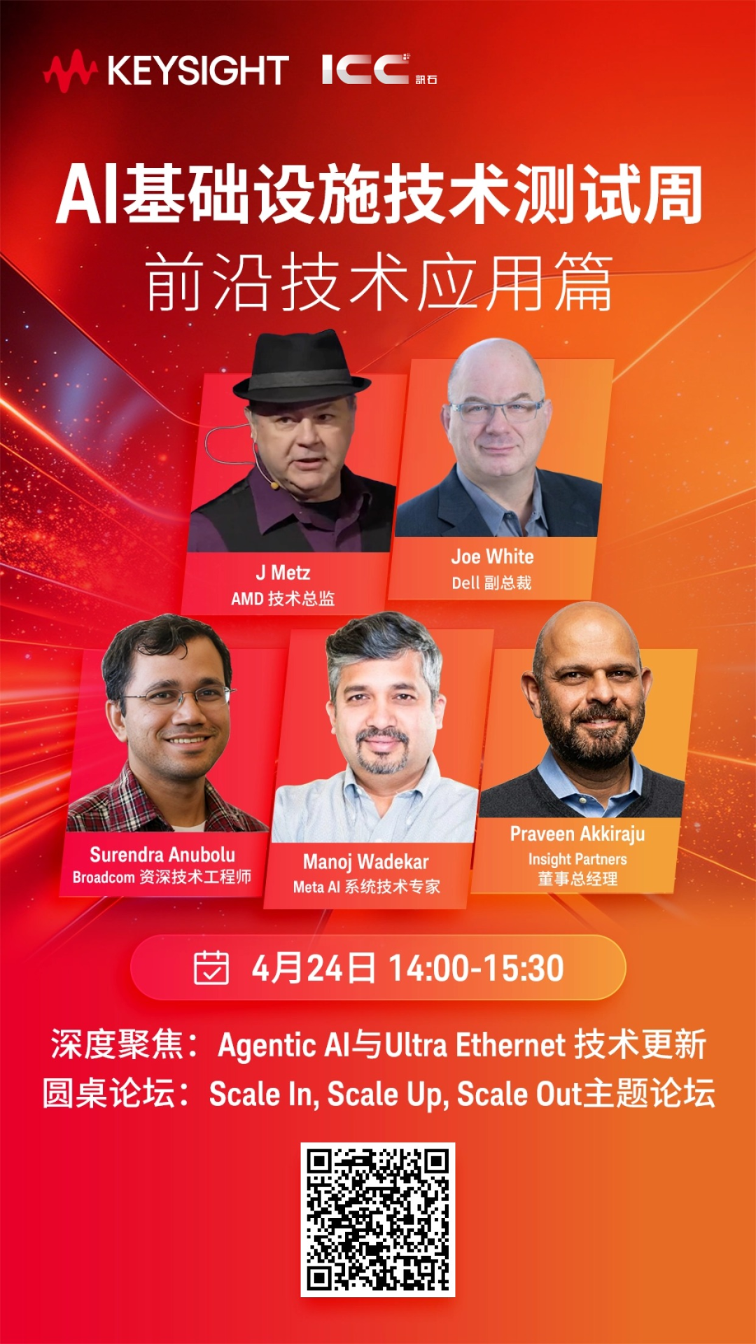 4 月 22-24 日(周三-周五),全球测试测量方案领先企业是德科技重磅开启 AI Unboxed 测试周直播活动,特别邀请微软、Meta、AMD、戴尔、博通等国际顶尖企业的十余位技术专家与高层领袖,联合Heavy Reading资深分析师、是德科技核心技术团队,深度解析 AI 基建核心技术及重构的机遇与挑战,预登记观看直播,共探前沿抢占先机!