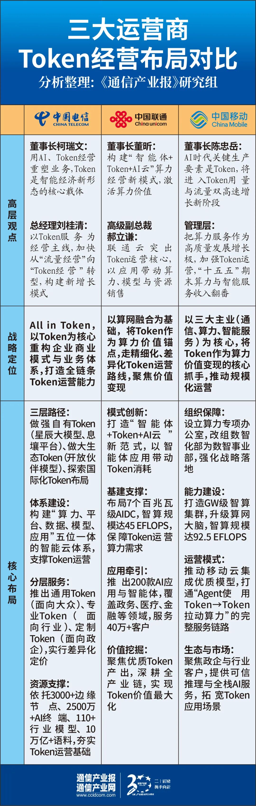 柯的讲话引起业界广泛关注。事实上,Token经营成为三大运营商共同的话题。中国移动将算力服务定位为高质量发展重要增长极,强调加强Token运营,打通“Agent使用Token、Token拉动算力”服务链路,目标“十五五”期末算力与智能服务收入翻番;中国联通则聚焦“应用+模型+资源”算力经营新模式,明确2026年算力投资占比超35%,以算网融合、云网一体夯实Token运营底座。