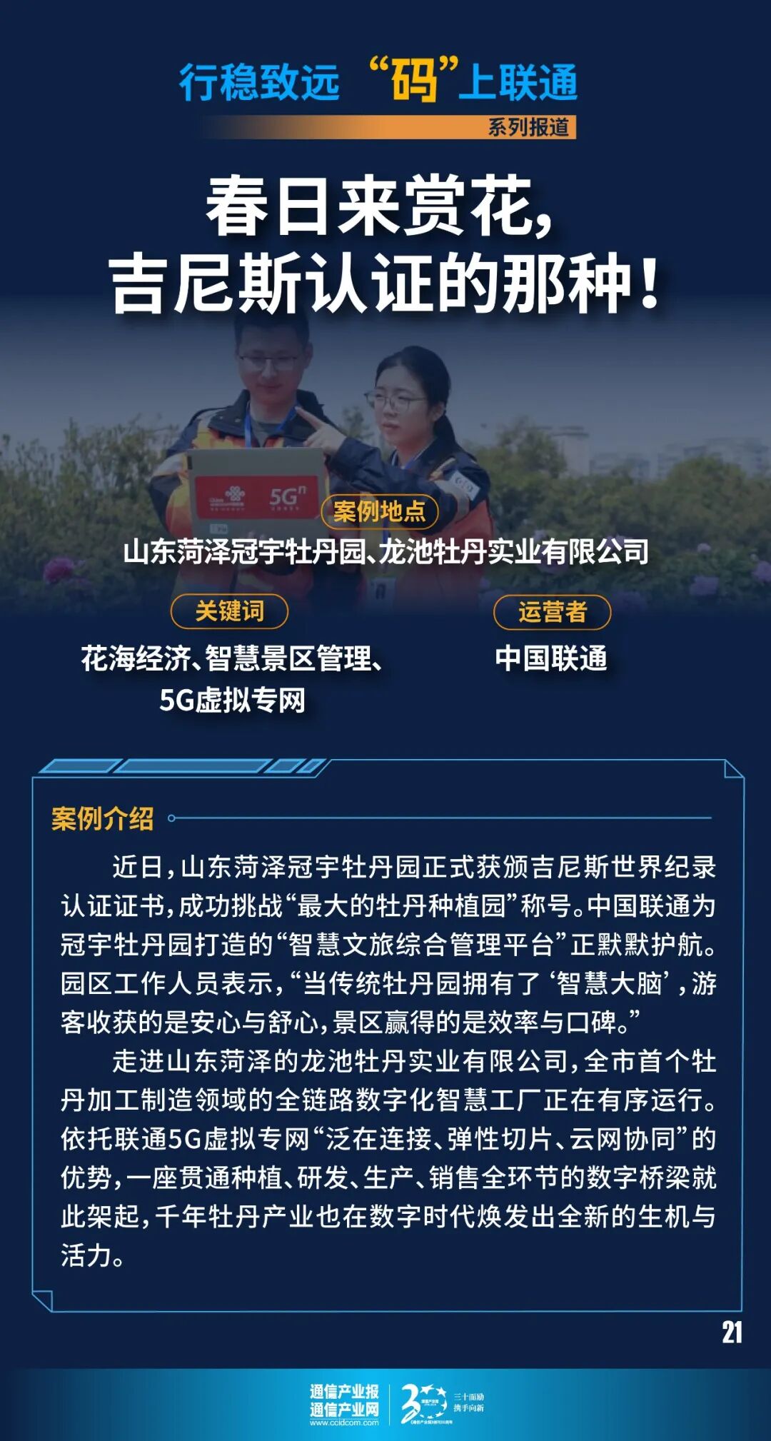 春风有信,花开有期。当四月的春风掠过神州大地,从街巷公园到湿地郊野,玉兰吐蕊、桃花初绽、杏花飞雪、郁金香铺锦,各色花卉次第登场,一座座城镇被晕染成一幅幅流动的春日画卷。 近日,山东菏泽冠宇牡丹园正式获颁吉尼斯世界纪录认证证书,以1100余亩总占地、900余亩核心牡丹种植区、660余个牡丹珍稀品种的规模,成功挑战“最大的牡丹种植园”称号。这一纪录的诞生,让冠宇牡丹园游客数量激增。当游客徜徉花海,中国联通为冠宇牡丹园打造的“智慧文旅综合管理平台”正默默护航。从线上预订门票开始,智慧便已先行。升级后的票务系统实时汇聚客流、停车、厕所使用、环境监测、安防状态等多维数据,构建起庞大而精细的数据库。游客只需轻点屏幕,即可轻松购票,更能依据实时客流信息合理规划行程,避开人潮,从容赏花。而当车辆驶入园区,智慧停车系统便无缝衔接——道闸与智能支付协同高效,大大缩短排队缴费的时间,管理人员对车位使用情况也了然于胸,可提前调度资源,让停车这件“小事”不再影响出游的好心情。据了解,今年园区全面升级业态布局,推出观花步道、网红打卡点、露营火锅、非遗市集、研学体验等多元化文旅项目,期间将有480场特色活动轮番上演,实现从传统“赏花观光”向“沉浸式潮玩体验”的全面转型。而在园中,无论是在游客中心小憩,还是在展馆内细品牡丹文化,高性能无线AP(AccessPoint,无线接入点)都默默提供着稳定高速的网络支持,信号满格,分享无忧。安全层面,AI云警系统基于前沿大模型技术,对海量视频进行深度分析,人员快速聚集、区域拥挤、危险闯入、烟火隐患等异常情况识别准确率高达90%;消防控制室内,火灾报警控制器、消防联动控制器等先进设备构建起智能化消防体系;巡更系统的接入,让安保人员巡逻轨迹实时可查,异常情况即时预警,管理人员对园区安全动态了如指掌。园区工作人员表示,“当传统牡丹园拥有了‘智慧大脑’,游客收获的是安心与舒心,景区赢得的是效率与口碑。”随着智慧化项目的落地实施,冠宇牡丹园正逐步成为智慧文旅新标杆,让每一次花开都成为更加美好的相遇。近年来,年轻人不再执着于去热门景区“人挤人”,基于假日特色的出行,逐渐向城郊及小城转移。在春天“赏花经济”的带动下,一座座小城在花海中迎来游客与商机。而“花海经济”的蓬勃人气,也考验着景区的接待能力。在陕西汉中,“2026最美油菜花海汉中旅游文化节”在汉台区老君镇皇塘片区拉开帷幕。在高效完成皇塘景区核心区域网络攻坚任务的同时,中国联通网络团队还持续推进应急广播、一键求助系统及智慧景区综合管理平台的建设,定制开发专属智慧景区管理软件,实现景区数字化、智能化运营。目前,已经对景区实现了人流、车流实时监测和异常预警,依托AI技术,精准识别拥挤、滞留等安全风险;全面部署应急广播和一键求助系统,游客遇到困难可快速求助,大幅提升景区安全保障能力;智慧景区综合管理平台则实现了停车、票务等各类信息的集成与统一平台调度,让游客在沉浸式欣赏花海盛景的同时,享受便捷、安全、贴心的智慧旅游服务。近日,“2026广州花朝节”也于广州珠江公园盛大启幕。为做好本次花朝节通信网络保障工作,中国联通提前开展网络隐患排查整改工作,对相关区域内重要站点、机房、杆塔等做好网络优化。活动期间,中国联通网络团队全天候巡检盯防,依托大数据动态分析网络运行情况,前后台密切联动、协同作战,确保关键时刻及时调动资源支撑保障。走进山东菏泽的龙池牡丹实业有限公司,全市首个牡丹加工制造领域的全链路数字化智慧工厂正在有序运行。依托联通5G虚拟专网“泛在连接、弹性切片、云网协同”的优势,一座贯通种植、研发、生产、销售全环节的数字桥梁就此架起,千年牡丹产业也在数字时代焕发出全新的生机与活力。在5000亩种植基地,物联网传感器遍布田间,土壤墒情实时可知、灌溉系统智能联动,每一株牡丹的生长状态都尽在掌握;在生产车间,MES(制造执行系统)驱动订单自动排产、质量全程追溯,从原料到成品的每一个环节都清晰可查。通过5GRedCap模组与多协议工业网关,曾经难以互联的老旧设备实现了毫秒级接入,生产数据实时归集、工艺参数动态优化,设备联网率提升60%,数据采集效率提高50%。全域物联网能耗平台则将电量采集精细至分钟级,用水异常秒级预警,碳排自动核算,年降能耗成本超百万元。该项目已获山东省工信厅“技术赋能方向”专项支持,形成“政策引导—企业主体—运营商赋能”的三元协同模式。当地政府评价称,“该项目以5G技术破解离散制造‘设备杂、管理粗、能耗高’三大痛点,为中小制造企业提供了‘模块化部署、轻量化投入、快速化见效’的转型路径,堪称‘一企带一链,一链成一片’的标杆。”当前,双方正持续深化“数字孪生+AI优化”应用,构建牡丹产业大脑。春风拂面,繁花满枝。从智慧文旅到精深加工,从文化传承到产业升级,中国联通将以数智之力守护满园芳华,续写春日华章。文:张婷婷、曹一菲、肖云、王欢
