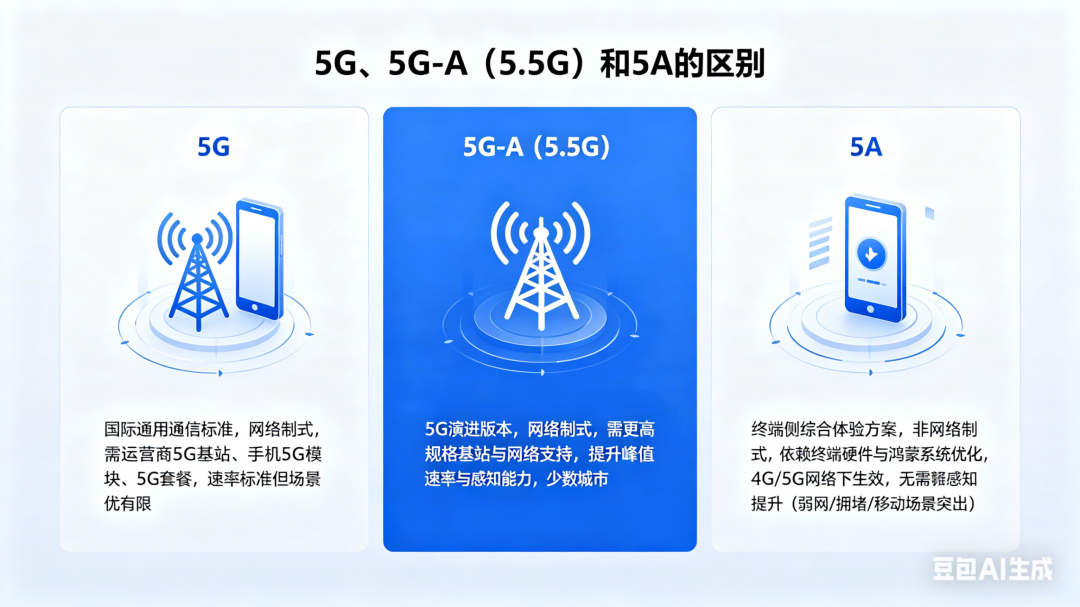 2026年4月20日,华为Pura 90系列正式发布,终端BG董事长余承东在发布会上的一句“我们的5A速度,比别人的5G更快”,让这项全新的通信技术瞬间成为焦点。发布会上的实测数据更具说服力——同一场演唱会场景中,Pura 90系列视频上传耗时较iPhone 17 Pro Max缩短50%,图片上传速度提升45%。但随之而来的疑问也层出不穷:华为Pura 90系列支持的5A通信,到底是什么?它是新的网络制式吗?和5G、5G-A(5.5G)又有什么区别?今天,我们就来逐一拆解,读懂5A通信的核心内涵。首先要明确一个核心认知:华为Pura 90系列的5A通信,既不是新的网络制式,也不等同于5G-A/5.5G,更不是简单的“5G马甲”,这是华为在发布会上反复强调的重点,也是读懂5A的关键前提。正如华为官方定义的那样,5A是华为依托自研软硬件协同技术,在现有4G/5G网络基础上精心构建的5A级综合通信体验,它的核心价值不在于“创造新网络”,而在于“优化现有网络体验”,让用户在不更换套餐、不依赖运营商基站升级的前提下,享受到更优质的通信服务。之所以命名为“5A”,核心在于它涵盖了五大核心能力,而这五大能力的英文首字母均为“A”,这也是“5A”名称的由来。很多人将5A理解为“5G的升级版本”,其实这种认知并不准确——如果说4G和5G是运营商提供的“道路类型”,那么5A就是华为在手机终端侧,把这条路开到最优状态的“优化方案”,是手机自带的“网络增强buff”,只要手机在4G或5G网络下达到高质量通信水平,就能触发5A体验,无需手动开启,也不产生额外资费。简单来说,5A是华为给用户的“网络体验勋章”,而非新的网络技术标准。那么,这五大核心能力具体是什么,又能给用户带来哪些实际体验?这正是5A通信的核心价值所在,也是它区别于常规5G的关键。五大能力各有侧重,协同发力,共同构筑起超越常规5G的全场景通信体验。第一个A,是Ahead Access(超前接入),核心解决用户最头疼的“断网后恢复慢”痛点。我们都有过这样的经历:出电梯、下地库后,手机要等好几秒才能重新联网,扫码付款、打车时难免陷入尴尬;高铁、地铁过隧道时,网络更是频繁卡顿。而5A的超前接入技术,通过AI算法实时感知网络状态变化,提前与周边基站建立连接链路,实现网络秒级恢复。据实测,其网络接入速度最高可提升51%,让出电梯、地库时的扫码、发消息不再“转圈圈”,高铁过隧道时的网络卡顿也能大幅缓解,真正实现“无缝联网”。第二个A,是Accelerated Throughput(速率加速),相当于给数据传输装上了“加速器”。在演唱会、商场、火车站等人员密集的拥堵场景,常规5G手机的网速会大幅下降,发朋友圈、传直播素材常常卡顿。而5A的速率加速技术,通过动态频宽聚合、多频段资源智能调度,整合离散的频谱资源,优化调制解调算法,最大化提升频谱利用率。实测显示,其下载速率最高提升30%,拥堵场景下的上传速度远超同类竞品,无论是传高清视频、开直播,还是发原图,都能保持流畅,彻底摆脱“信号满格却卡顿”的困扰——就像同样的食材,普通手机只能做出“乱炖”,而Pura 90的5A技术,能把网络资源“烹饪”成更流畅的体验。第三个A,是Advanced Low Latency(进阶低时延),直接决定游戏、支付、抢单等场景的体验。时延就像网络的“反应速度”,时延越高,操作越滞后:手游团战技能释放不跟手、移动支付“转半天”、抢票时错过时机,这些都是高时延带来的困扰。5A的进阶低时延技术,通过优化协议栈、精简基带处理流程,压缩端到端传输路径,减少数据中转环节,将通信时延降至毫秒级,时延敏感场景响应速度最高提升49%。实测显示,玩王者荣耀等手游时,5A延迟可稳定在较低水平,比普通5G手机减少明显,这看似微小的差距,在电竞场景中就相当于“提前半个车身”的优势,让操作更跟手、响应更迅速。第四个A,是Amplified Antenna(天线增强),专为弱信号场景优化,就像是信号覆盖的“扩音器”。在山区、乡村、老小区、地下室等弱信号盲区,常规手机常常出现信号弱、通话断音、上网卡顿的问题,甚至无法联网。而5A的天线增强技术,采用多天线阵列设计与智能波束赋形技术,强化信号接收与穿透能力,提升信号强度与信噪比。得益于这项技术,信号覆盖范围最高提升50%,弱信号区域的通话更清晰、掉话率更低,用户上网时不易出现突然断网的情况,在偏远地区刷视频、看直播的缓冲次数也大幅减少,就连地下车库扫码缴费,也能避免“反复找信号”的尴尬,弱网连接成功率显著提升。第五个A,是Adaptive Networking(自适应组网),聚焦高速移动场景,解决高铁、高速行驶中的网络稳定性问题。很多人都有过这样的体验:在300km/h的高铁上,手机网络频繁在5G和4G之间切换,视频通话卡顿、在线游戏掉线,严重影响体验。5A的自适应组网技术,通过多基站智能协同与无缝切换算法,动态分配网络资源,提前预判基站切换时机,避免频繁切换导致的卡顿、掉线。实测显示,其网络切换稳定性提升83%,即便是在高速移动中,4K视频通话、在线会议、手游等场景依然能保持流畅,大幅减少“5G/4G频繁切换”的困扰,让移动场景的网络体验更有保障。了解了5A的五大核心能力,很多人会好奇:不依赖运营商基站升级,华为是如何实现这些优化的?其实,5A的核心优势在于终端侧的全链路优化,通过硬件与软件的协同创新,将五大能力完美落地,其实现路径可从天线、射频、算法三大维度清晰拆解,这也是5A