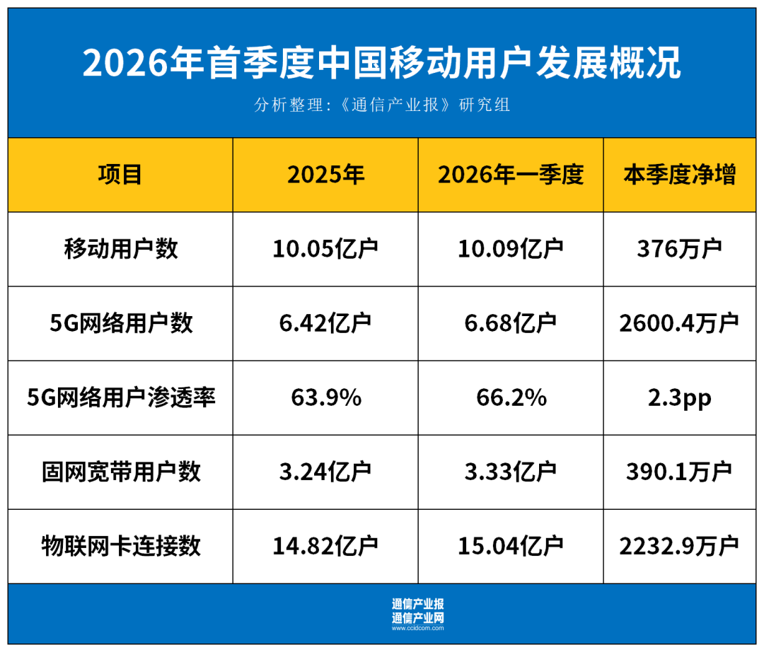 与此同时,中国移动公布2026年首季度用户数据。据公告,截至3月31日,中国移动移动用户达10.09亿户,本季度净增376万户。其中,5G网络用户达6.68亿户,本季度净增2600.4万户,5G网络用户渗透率为66.2%,较2024年增加2.3个百分点。中国移动固网宽带用户达3.33亿户,本季度净增390.1万户。物联网卡连接数达15.04亿户,本季度净增2232.9万户。