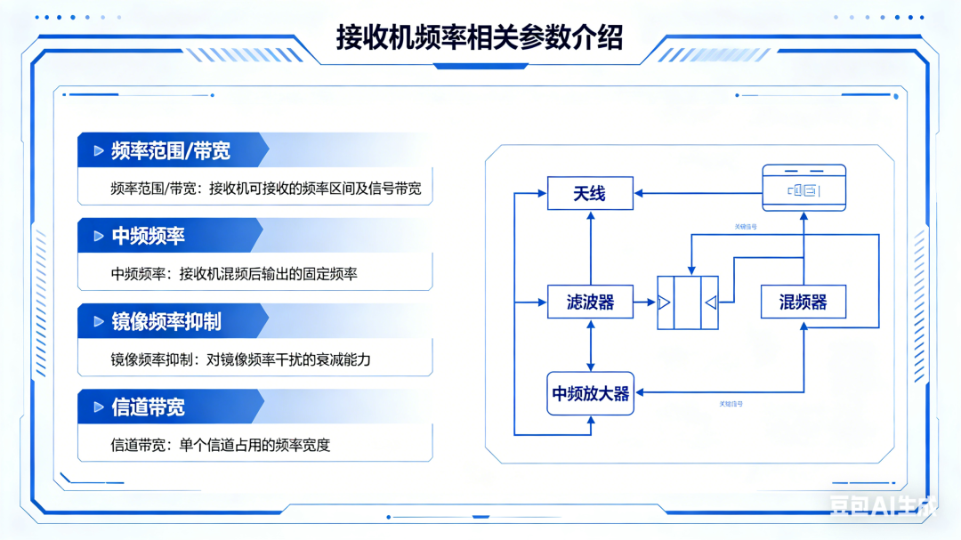 这类参数与接收机的工作频率直接相关,决定了接收机的适配频段和抗干扰能力,实操中需结合频谱规划选型:频率范围/带宽:接收机可正常工作的频率区间(如2.4-2.48GHz、868MHz),需与应用场景的频谱规划完全匹配;中频频率 (IF):仅适用于超外差接收机,是连接射频信号与基带信号的关键,需合理选择以避免镜像干扰,常见标准值为21.4MHz、450kHz等;镜像频率抑制:超外差接收机特有的抗干扰指标,衡量接收机抑制镜像频率干扰的能力,以dB表示,数值越高,抗镜像干扰效果越好,核心解决方法是合理选择中频和优化前端滤波;信道带宽:单个信道的频率宽度,直接影响信号传输速率和抗干扰能力——带宽越窄,抗干扰能力越强,但传输速率越低;带宽越宽,传输速率越高,但抗干扰能力越弱,需根据需求权衡。系统级指标:整机性能的“综合体现”