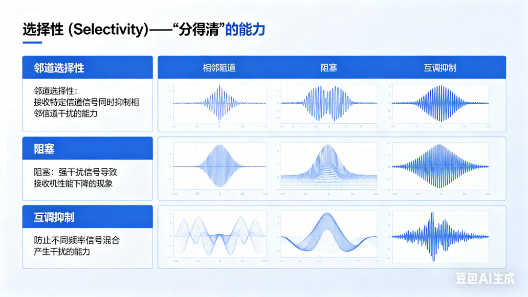 随着无线频谱日益拥挤,不同应用、不同设备的信号相互叠加,仅“听得见”远远不够,还需“分得清”——这就是选择性的核心作用:接收机区分目标信号与各类干扰信号的能力,直接决定了复杂环境下的通信稳定性。选择性的核心衡量参数主要有3个,实操中需重点关注:(1)邻道选择性(ACS)—— 拒绝“邻居干扰”