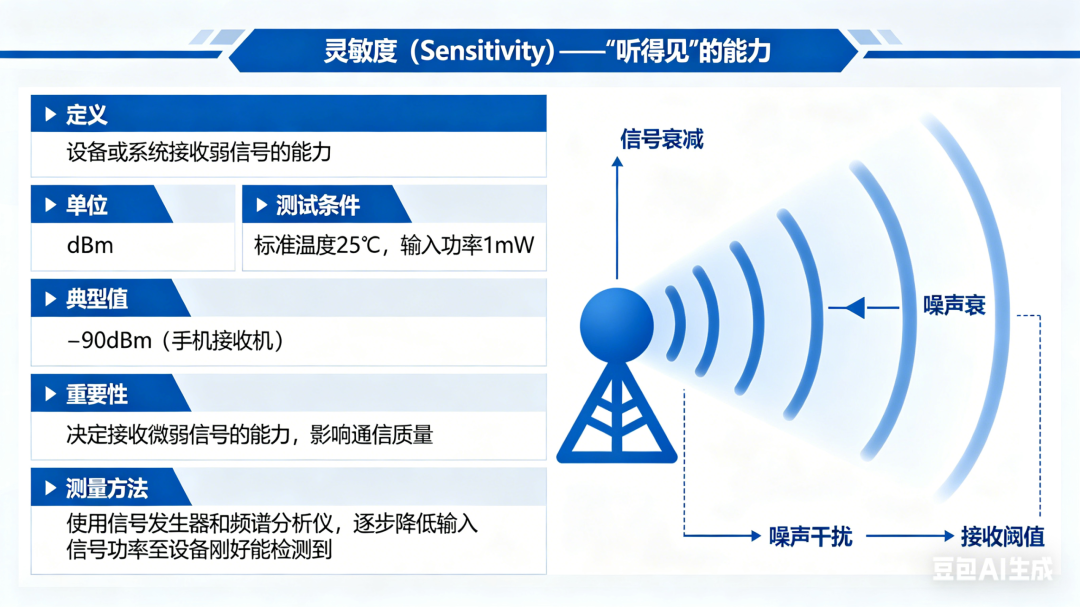 射频接收机的核心性能,由灵敏度、选择性、动态范围三大指标决定,三者相辅相成,共同决定了接收机的基础表现,是选型和设计的核心考量。1. 灵敏度 (Sensitivity)——“听得见”的能力