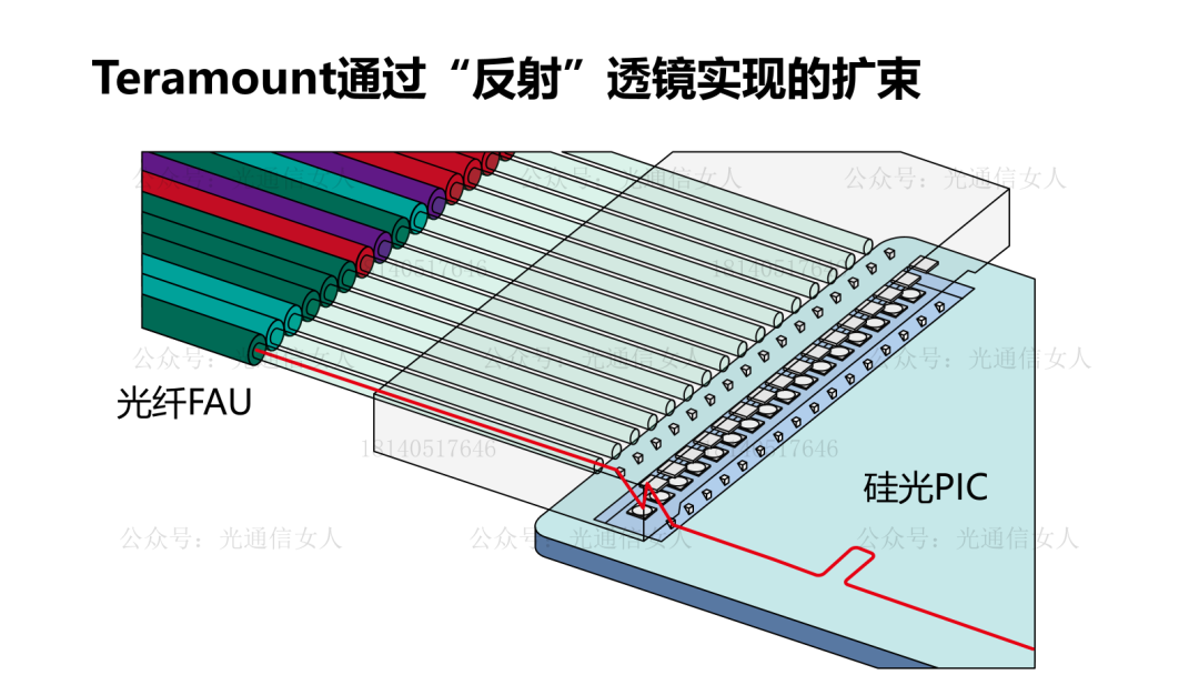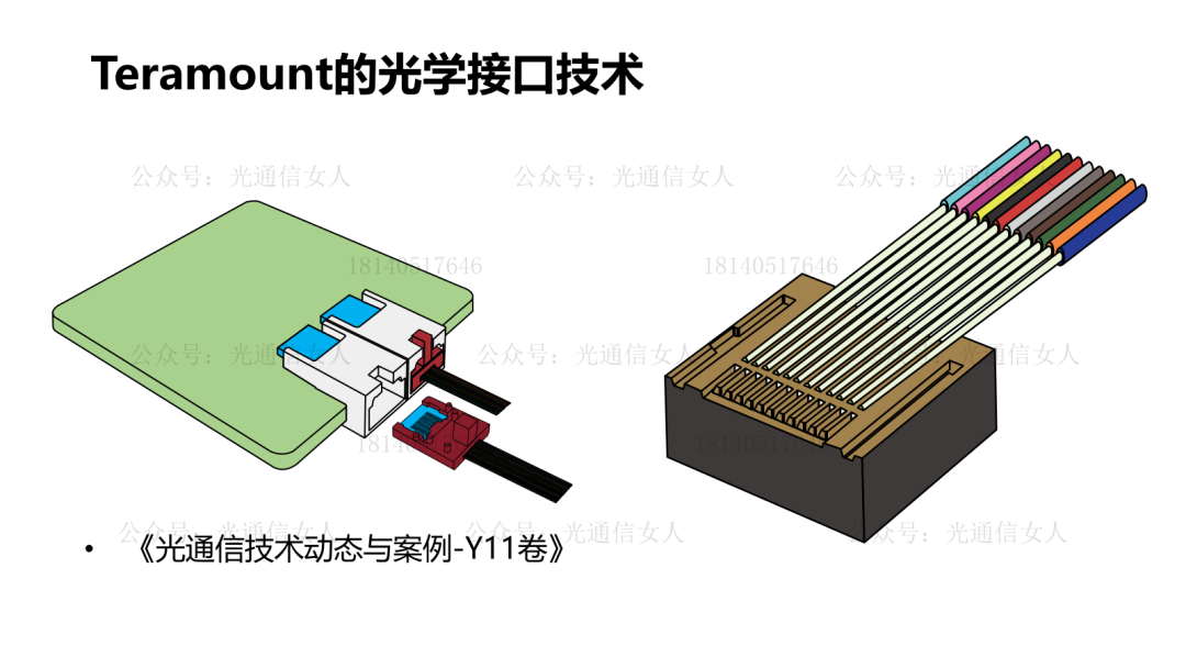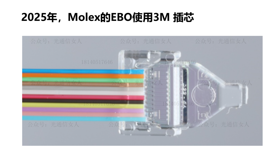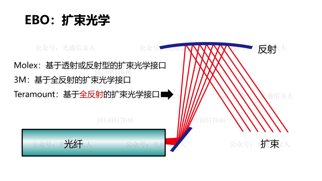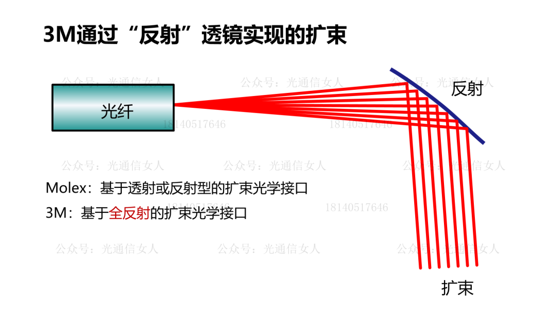 Molex很多年的EBO光接口,E是expanded扩展的意思,beam就是光束直径。光纤的光束直径很小,把光斑扩大,就方便耦合,且光接口无需接触。简单理解就是在光接口端面放一排透镜,用于准直,采用透镜扩束的“非接触”的空间耦合设计。因为光纤不接触,当然也就是光纤端面的灰尘不care了。Y12T100 什么是“准直”透镜,用在什么场景,扩束准直,可以是透射式结构,也可以是反射式结构,再看2025年Molex与3M合作的新闻给出的图片。2024年《光通信技术动态与案例-Y10卷》,写过3M的这个“内全反射TIR”扩束EMO的光连接器的结构。3M的EBO接口的插芯用在Molex的MPO连接器,这就是新闻里提到的技术。终于回到主题了,在《2023公众号合集》、《光通信技术动态与案例-Y11》卷,《OFC2025-PPT汇编》都收录过Teramount的技术。Teramount是通过内全反射的扩束技术,用于光纤与硅光芯片的耦合。都是EBO的扩束光学,Molex收购Teramount可拓展应用领域。5月13日,《高速信号调制器格式NRZ、PAM4、QPSK以及n-QAM》,可详询18140517646