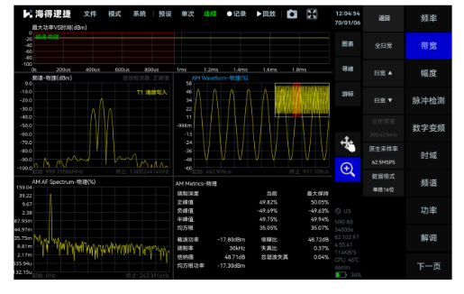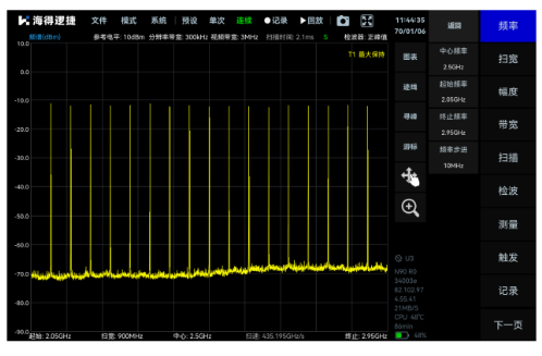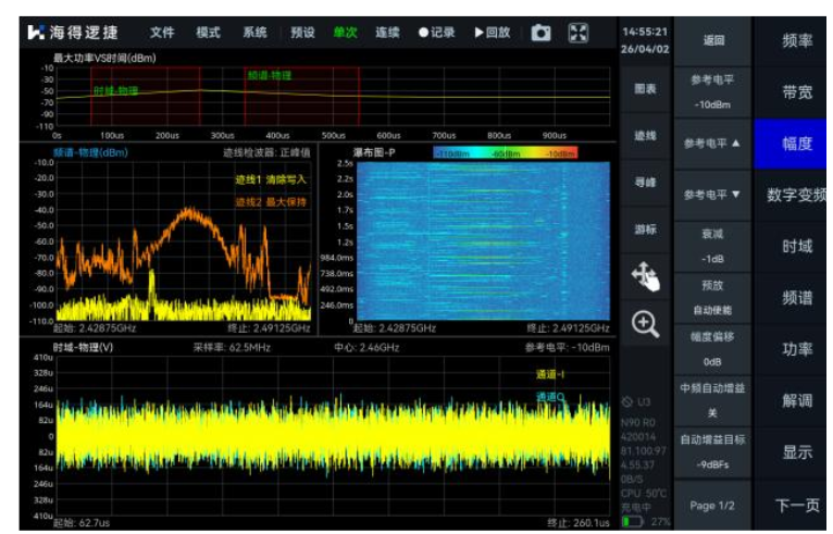 如果说信号源是“发射端”的核心,那频谱仪就是“接收端”的眼睛——不管是信号分析、干扰排查,还是性能验证,都离不开它。海得逻捷这次推出的PXA系列手持实时频谱仪,更是兼顾了便携性和高性能,尤其是最便宜的PXN4.5GHz型号,性价比直接拉满。先看外观和便携性:配备10.1英寸全触屏,操作直观流畅;重量仅1.5kg,比普通笔记本还轻,单手就能携带;典型工作时间长达3小时,不管是实验室调试,还是户外现场测试,都能轻松应对,再也不用背着笨重的台式频谱仪跑现场。核心性能同样亮眼:频率范围覆盖9kHz至40GHz,分析带宽达100MHz,1GHz频偏10kHz相位噪声典型值优于-100dBc/Hz——这样的参数,哪怕是面对复杂的信号分析场景,也能精准捕捉信号细节,媲美不少中高端台式频谱仪。要知道,国际品牌同级别手持频谱仪,价格往往在十几万,而海得逻捷PXA系列,同样把价格控制在了万元以内,差距一目了然。更重要的是,它的功能足够全面,标配高级测量功能,包括频谱分析、AM/FM模拟解调分析、相位噪声分析、占用带宽、信道功率等,无需额外付费,就能满足大多数日常测试需求;同时还提供高级脉冲测量与数字解调选件,可根据自身需求灵活选配,兼顾实用性和经济性。我们重点看看最便宜的PXN4.5GHz型号,它提供了多种实用的工作模式,覆盖不同测试场景,新手也能快速上手:标准频谱分析模式:一站式信号性能评估平台,支持频谱全景扫描、信道功率、占用带宽、邻道功率比等多种测量功能,还能记录和回放频谱数据、显示瀑布图,搭配信号追踪、峰值表等辅助工具,轻松完成信号性能检测。IQ流模式:支持50MHz/100MHz(选件50)分析带宽,可通过多种触发方式获取IQ数据,支持IQ时域波形图、频谱、瀑布图显示,以及AM/FM解调、数字下变频(DDC),适合复杂信号的深度分析。检波分析模式:可对分析带宽内的时域信号进行检波分析,尤其适合脉冲类信号的测量,能清晰捕捉带内功率与时间的关系。实时频谱分析模式:由FPGA内置的高速FFT引擎驱动,确保FFT帧之间无空隙、无交叠,实现全带宽覆盖下的实时监测,再也不用担心错过瞬间出现的信号干扰。相位噪声测量模式:支持1Hz至10MHz偏移范围,可评估载波的相位稳定性,内置载波自动搜索功能,无需手动调整,就能快速定位目标载波,省时又省力。其他实用模式:可选配基础矢量调制分析(支持多种数字调制信号解调)、脉冲分析(可测量32ns及以上脉冲信号的各项参数);还支持谐波分析(可检测10次以内谐波分量)和热力图模式(集成GNSS定位,可生成可视化热力图,适合无线监测和干扰分析)。国产崛起,射频人的“个人实验室”终于不再是梦