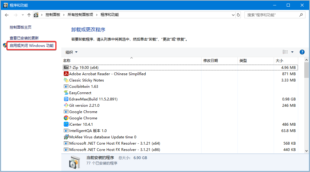 进入“程序和功能”页面。