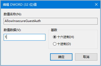 修改注册表项AllowInsecureGuestAuth的值为1(如果不存在该注册表项,则需新建)。