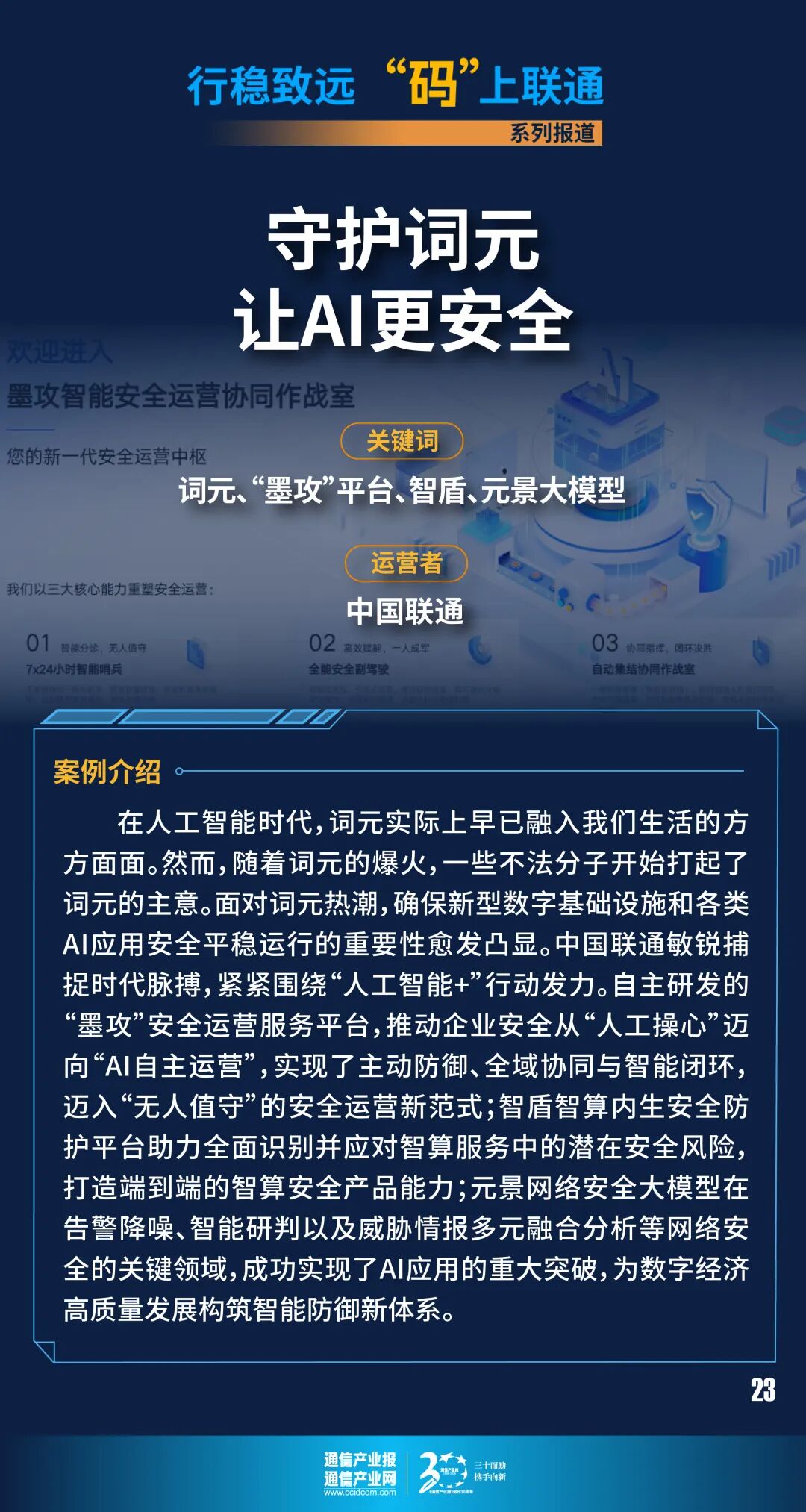 近期,国家数据局正式定名的AI领域核心术语——词元(Token)成为网络热词。在人工智能时代,词元实际上早已融入我们生活的方方面面。AI写作、修图、剪辑,大模型生成的每一段话、识别的每一幅图像,数字世界的“临时身份证”如手机银行动态口令,以及包含电子票、游戏皮肤、会员积分等在内的数字化权益证明,都在消耗词元。根据最新数据显示,到今年3月份,我国日均词元调用量突破140万亿,比上年末增长超40%。然而,随着词元的爆火,一些不法分子开始打起了词元的主意,伺机布设各种陷阱。面对词元热潮,确保新型数字基础设施和各类AI应用安全平稳运行的重要性愈发凸显。中国联通敏锐捕捉时代脉搏,紧紧围绕“人工智能+”行动发力,凭借自主研发的“墨攻”安全运营服务平台、智盾智算内生安全防护平台和元景网络安全大模型,全力为数字经济高质量发展构筑智能防御新体系。AI技术的深度应用正全面革新安全运营的传统模式。传统方式依赖人工分析与规则匹配,不仅效率低下、漏报误报频发,且安全事件响应处置滞后,已成为企业安全运营的短板。针对这些痛点,中国联通基于云网数据资源禀赋,汇聚生态组件,打造了AI超级智能体。凭借其强大的数据处理能力、精准的模式识别和持续的自主学习优势,能够从海量安全数据中实现秒级威胁检测与实时预警,通过自动化响应机制提升安全事件处置效率,使安全专家得以从重复性工作中解脱,将更多精力投入到高级威胁分析、战略决策等更具挑战性的工作中。依托AI超级智能体,中国联通打造了全域安全“超级指挥家”——墨攻AI协同作战中枢。其以智能大脑为核心,指挥7×24小时待命的AI铁军,完成资产盘点、漏洞管理、事件处置等全链路闭环作战,深度重构安全运营流程,推动企业安全从“人工操心”迈向“AI自主运营”,实现了主动防御、全域协同与智能闭环,迈入“无人值守”的安全运营新范式,为企业筑牢智能安全防线。此外,墨攻通过融通共生的“组件+平台+服务”创新模式,将智能协同能力延伸至生态组件。该模式实现了250+产品组件互联互通,有效打破了传统安全产品间的互联互通壁垒,形成“融合开放、创新供给”的服务新模式,不仅推动了产业链上下游的协同与整合,更为构建新一代主动防御体系奠定了坚实的基础。通过将原本分散的阻断信息、安全告警和终端日志等数据要素在全平台高效流转与价值共享,使防御体系从“单点响应”升级为“全域联动”。随着人工智能技术与应用的爆发式增长,AI智能算力需求井喷,从政务服务到金融风控,从医疗诊断到工业制造,算力如同水电一般流入千行百业,为人们生产生活带来便利。与此同时,其安全性也牵动着社会民生。传统的安全防护手段已难以应对新型智算安全威胁,对此,中国联通推出“智盾智算内生安全防护平台”,助力全面识别并应对智算服务中的潜在安全风险,打造端到端的智算安全产品能力,为各类智算应用提供内生式、一体化的安全解决方案。围绕智算基础设施和模型应用两大核心方向,提供一体化的安全防护方案。该平台可为智算基础设施的稳定性以及模型输出的可靠性提供安全保障,基础设施层面,聚焦网络、负载、管理三大关键节点,整合联通DDoS防御、网络入侵防御、主机容器安全、平台安全管理审计等系列产品,构建起可防御、可管理、可审计、可溯源的立体化安全防护体系;模型与应用层面,重点针对模型、数据、应用三个维度,结合大模型风险评估、内容安全围栏、大模型防火墙、数据清洗审计等工具,形成覆盖智算服务全生命周期的安全保障机制。多层级联动防护,提升智算公共服务及私有化交付场景的安全效能。该平台融合联通智算基础设施和服务能力,采用平台化思路整合原子级安全能力,实现全局视角的风险评估、分析研判、响应处置与事件溯源,构建起涵盖事前安全评估、事中主动防御、事后追踪溯源的一体化安全架构,使整体安全防护效率提升30%以上。面对严峻的网络安全威胁,中国联通以“大模型+小模型+安全工具”协同架构,构建了特色AI赋能安全技术体系。元景网络安全大模型整合了算力、数据、场景三大核心优势:在算力层面,依托运营商资源,于2025年建成5000P以上智能算力集群;在数据层面,联合行业内多家合作伙伴,汇聚近2TB安全语料,形成覆盖36大类知识、100+APT报告的知识库;在场景应用中,将安全运营、攻防渗透等场景化应用经验转化为模型优化的动力,实现了技术与场景的深度融合。在生态构建过程中,中国联通创新推出“智能体超市”模式,整合行业上下游资源,联合行业头部企业,共同推动生态发展。“智能体超市”将安全问答、告警研判、攻击流程编排等多样化智能体组件,以标准化、模块化的形式对外开放,如同超市商品般可供生态伙伴按需选取、灵活组合,实现安全知识、技术能力的高效互通共享。当前,中国联通正全力推进“安全AI行业大模型+安全小模型+安全工具”矩阵布局的深化工作。凭借对前沿技术的持续创新与深度融合,中国联通在告警降噪、智能研判以及威胁情报多元融合分析等网络安全的关键领域,成功实现了AI应用的重大突破。这一系列成果,不仅为AI在安全领域的赋能提供了强大且稳定的“安全动能”,更充分展现出联通作为央企加快推动高水平科技自立自强的决