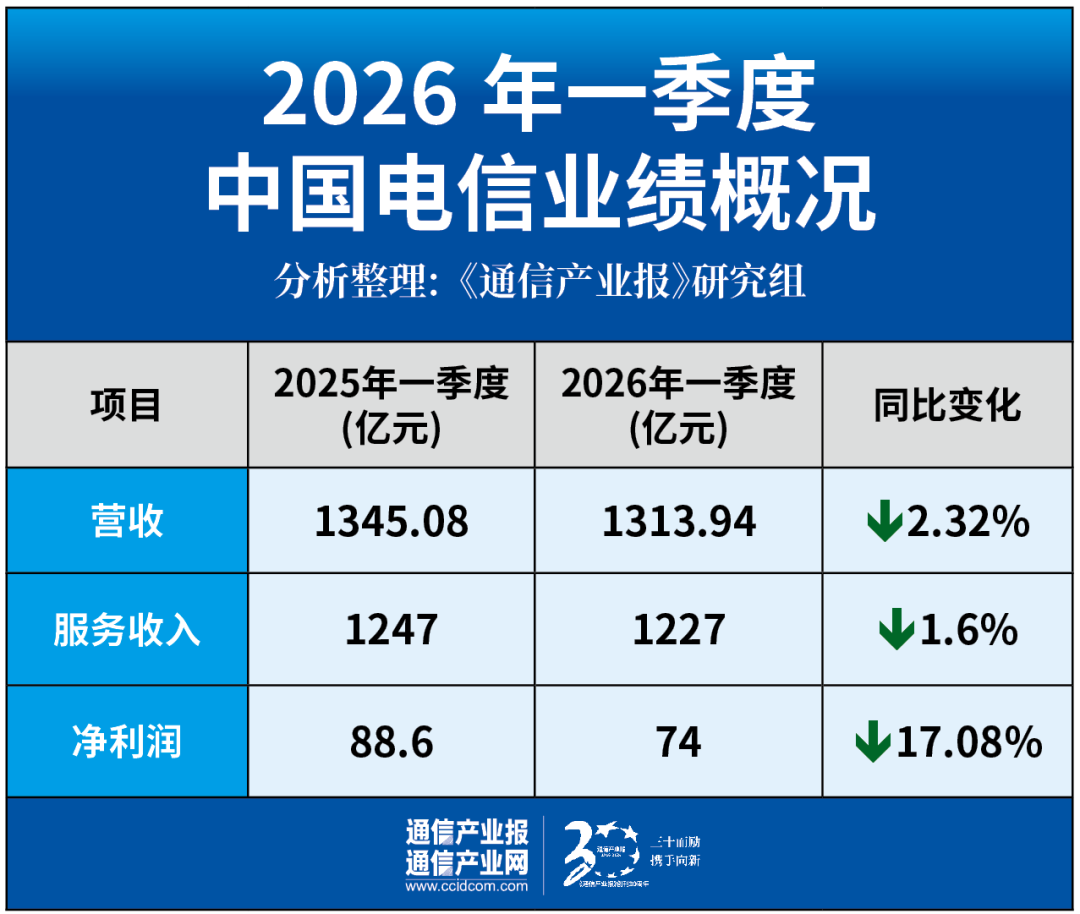 4月23日,中国电信发布2026年第一季度报告。报告期内,公司营业收入1,314亿元,同比下降2.32%;服务收入1,227亿元,归属于上市公司股东的净利润74亿元,同比下降17.08%。