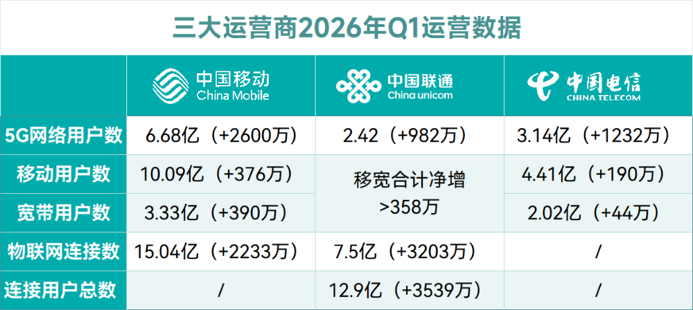 2026年第一季度,通信行业迎来了一场罕见的“倒春寒”。中国移动、中国电信、中国联通三家巨头集体交出了一份略显沉重的成绩单:净利润全面大幅下滑。其中,中国移动归母净利润同比下降4.2%,中国电信下降17.08%,中国联通下降17.6%。此外,除了中国移动勉强维持了1.0%的营收微增,联通与电信均陷入营收负增长(分别为-0.5%和-2.32%)。对于习惯了“稳健增长”的通信业而言,这种集体性的业绩承压并不多见。但这背后并非源于运营商经营能力的恶化,而是一次由增值税上调引发的短期阵痛,叠加传统连接业务见顶、新兴算力业务尚未完全接棒的结构性困境所致。首先,一季度利润断崖式下滑的核心变量,并非市场需求萎缩,而是增值税税率的上调。自2026年1月1日起,电信服务增值税税率由6%正式调整为9%。这一3个百分点的调整,对于高固定成本、低边际成本的通信行业而言,冲击是直接的。基站折旧、电费、人工等刚性成本不随收入同步下降,导致税负增加直接侵蚀了利润空间。对此,三大运营商曾相继发布公告表示,这将对公司收入及利润产生影响。从财报数据看,这一影响已在一季度集中体现。以中国联通为例,一季度营收1028亿元,税前利润61亿元,税前利润率本就处于低位(约5.9%),税率上调引起的收入下滑就可能导致利润出现双位数百分比的波动。中国电信情况类似,营收下滑叠加税率冲击,利润降幅扩大至17%以上。唯一例外是中国移动,作为行业龙头,展现出较强的抗压能力,利润降幅最小(-4.2%),且营收保持正增长。若剔除税率影响,其核心通信业务的盈利能力其实保持稳健。运营商作为央企,承担财政贡献是不可推却的职责,但如何在高税负下保持再投资能力,将是管理层面临的最大考验。未来三大运营商是否调整收费价格,将部分成本转嫁给用户,还未可知。此外,财政部明确电信行业2026年国有资本税后利润上缴比例由20%上调至35%。虽然这是年度结算事项,不影响一季度现金流,但可能迫使运营商在全年资本开支上更加精打细算,并间接影响未来的盈利能力。撇开税率上调因素,回归通信主业,三大运营商的表现则各有千秋,折射出存量竞争时代不同的战略路径。中国移动依然是行业的“压舱石”,是唯一实现“移动+宽带”双位数百万级净增的运营商。一季度,其移动用户净增376万户,宽带用户净增390万户。这种均衡且强劲的增长,显示出移动在家庭和个人市场强大的渠道掌控力和品牌粘性。其5G网络用户季度新增2,600万,继续领跑全行业,总数达6.68亿,5G渗透率为66.2%。中国电信的基础连接增长明显放缓。移动用户仅净增190万户(去年同期为495万户),宽带用户更是仅净增44万户,几乎陷入停滞。不过,中国电信5G用户渗透率达到71.3%,为三家中最高。中国联通采取了不同的披露策略,未单独拆分移动和宽带净增,而是强调“移宽合计净增超过358万户”,并推动融合套餐ARPU稳定在百元以上。其物联网连接数净增3203万,超越移动的2233万,结合中国联通连接用户总净增3539.4万,可知物联网连接数贡献了绝大部分净增份额。综合来看,传统连接市场已高度饱和。工信部最新数据显示,截至2026年3月末,全行业移动电话用户总数达18.36亿户,季度净增仅920.1万户。在庞大基数下,用户规模扩张的红利基本见顶,单纯依靠新增用户拉动收入的增长模式难以为继。运营商必须寻找新的价值锚点。面对传统通信业务增长见顶,三大运营商均将算力业务提升至最高战略层级,视为驱动高质量发展的关键引擎。在整体营收承压背景下,算力/云业务均实现同比正增长,成为少数亮点,但增速普遍低于前几年的爆发期,进入稳健增长阶段。中国联通披露一季度算力业务收入154亿元,同比增长8.3%。其中智算中心收入同比增长11.7%,联通云服务近44万政企大客户,显示其向高价值智算转型的成效。中国电信披露天翼云收入同比增长6.8%,智能收入(含AI应用)同比大增39.4%。中国电信在报告中表示,要全面实施云改数转智惠战略,以打造领先的 AI 服务商为目标,以 Token 服务为经营主线,打造高质量数智化的产品和服务。中国移动未单独披露算力具体营收,但强调要持续做强做优做大通信、算力、智能服务。一季度中国移动研发费用同比大增22.3%(至39亿元),在建工程大增35%(至835亿元),显示其在算力基础设施上的投入仍在加码。尽管算力业务增速普遍高于传统通信业务,然而,其在运营商总营收中的占比依然较低。以联通为例,154亿元的算力收入仅占其总营收(1,028亿元)的15%左右。因此增速并不足以完全抵消传统通信业务下滑和税率上调的影响。展望未来,算力业务无疑是确定的增长方向,但当前难以立即填补传统业务放缓留下的缺口。运营商仍需要在稳住基本盘的同时,继续加快新兴业务的规模化变现能力。
