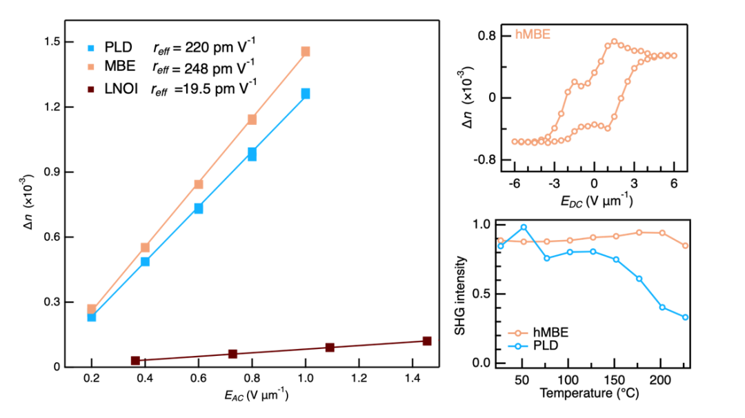 图 3 电光性能与可靠性综合评估。左图显示有效电光系数(reff)对比表征,通过对折射率变化随交流电场(EAC)变化的线性拟合,测得hMBE工艺制备的BTO薄膜有效电光系数达到248 pm/V,高于PLD工艺制备的BTO薄膜(220 pm/V),二者均远高于薄膜铌酸锂(LNOI)校准样品;右上图为hMBE制备的BTO薄膜畴翻转电光滞回曲线,折射率变化(Δn)随直流电场(EDC)变化的滞回环形态完整且对称;右下图证实BTO薄膜在200 °C 高温下,仍维持高的铁电极化SHG响应。