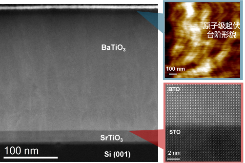 图 2 原子级界面到表面台阶形貌的高质量生长。主图展示BTO/STO/Si异质结构的截面STEM 全景图,清晰显示薄膜高度均匀且无贯穿性位错;右下高分辨图像显示了原子级锐利的共格界面和晶格完美周期性排列;右上AFM插图显示清晰的原子级台阶形貌,证实了薄膜处于理想的二维逐层生长模式。