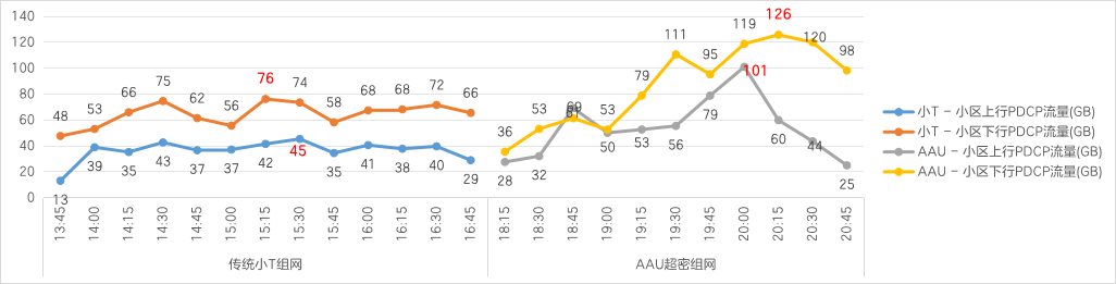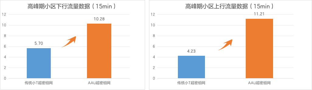 在重大体育赛事保障中,在一半封闭式体育场馆进行了AAU超密组网应用。相较于传统小T组网方案,改造后容量明显提升,因容量不足而压抑的业务量得以释放,整体感知时延明显改善,用户体验直线上升。