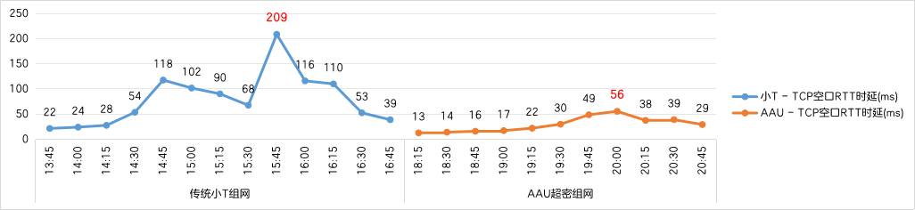 场馆总体区域15分钟下行流量峰值从76GB增加到126GB(增加65%),上行峰值从45GB增加到101GB(增加124%),TCP空口RTT时延峰值从209ms下降到56ms(改善73%)。