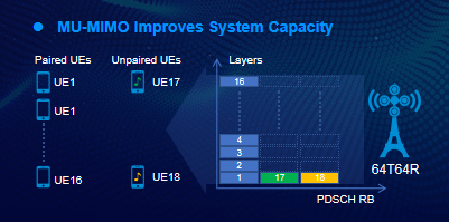 利用发射与接收端的多天线,实现多个终端同一时刻使用相同的频段来通信,充分利用空间资源,继而显著提升系统容量。
