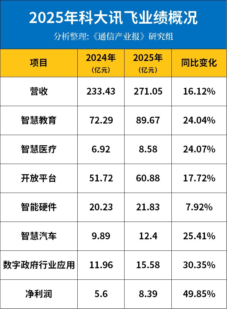 具体来看,2025年,科大讯飞智慧教育业务实现营收89.67亿元,同比增长24.04%;智慧医疗业务实现营收8.58亿元,同比增长24.07%;开放平台业务实现营收60.88亿元,同比增长17.72%;智能硬件业务实现营收21.83亿元,同比增长7.92%;智慧汽车业务实现营收12.40亿元,同比增长25.41%;数字政府行业应用业务实现营收15.58亿元,同比增长30.35%。