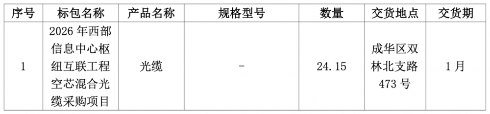 来自中国电信阳光采购网消息,中国电信成都分公司2026年西部信息中心枢纽互联工程空芯混合光缆采购项目正式启动,预估规模为1937554.50元(含税)。公告显示,本项目采购内容为采购146芯层绞式结构混合光缆,此光缆由1管2芯空芯光纤,6管12芯G.654.E光纤,6管12芯G.652.D光纤组成,数量为24.15皮长公里。中国电信研究院高级工程师冯立鹏此前在CIOE中国光博会联合C114举办的“