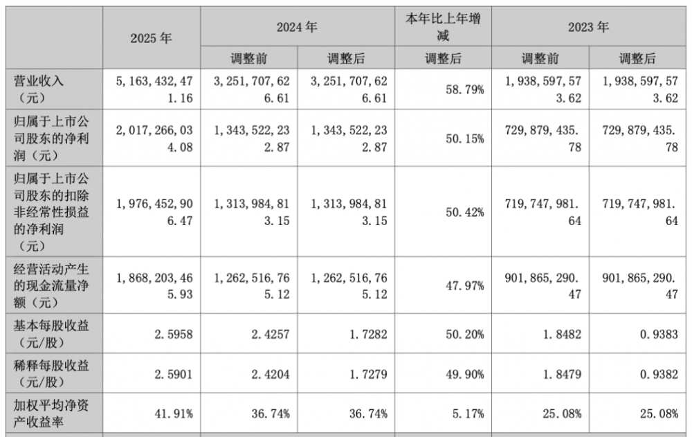 今日,天孚通信公布2025年度业绩。报告期内,天孚通信实现营收51.63亿元,同比增长58.79%。归属于上市公司股东的净利润20.17亿元,同比增长50.15%;扣非净利润19.76亿元,同比增长50.42%。天孚通信表示,报告期内,人工智能行业加速发展与全球数据中心建设,带动了高速光器件产品需求的持续稳定增长,叠加公司智能制造持续降本增效,共同促进了公司有源和无源产品线营收增长。另一方面,报告