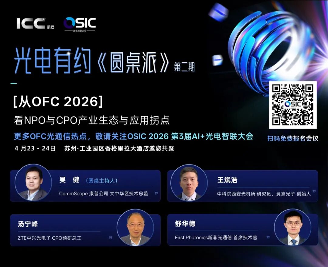 ICC讯石光电有约《圆桌派》第二期嘉宾聚焦NPO与CPO的定位与差异,国内外技术路线偏好不同以及讨论封装、散热与风险管控等关键挑战。专家共识:AI算力爆发驱动光互联技术迭代,NPO与CPO并非替代关系,而是依托不同场景形成互补;标准化推进将加速NPO规模化,而CPO技术成熟度与产业链协同,将决定其大规模商用节奏。ICC讯 4月3日,ICC讯石举办的光电有约《圆桌派》第二期顺利收官。本次圆桌以“从O