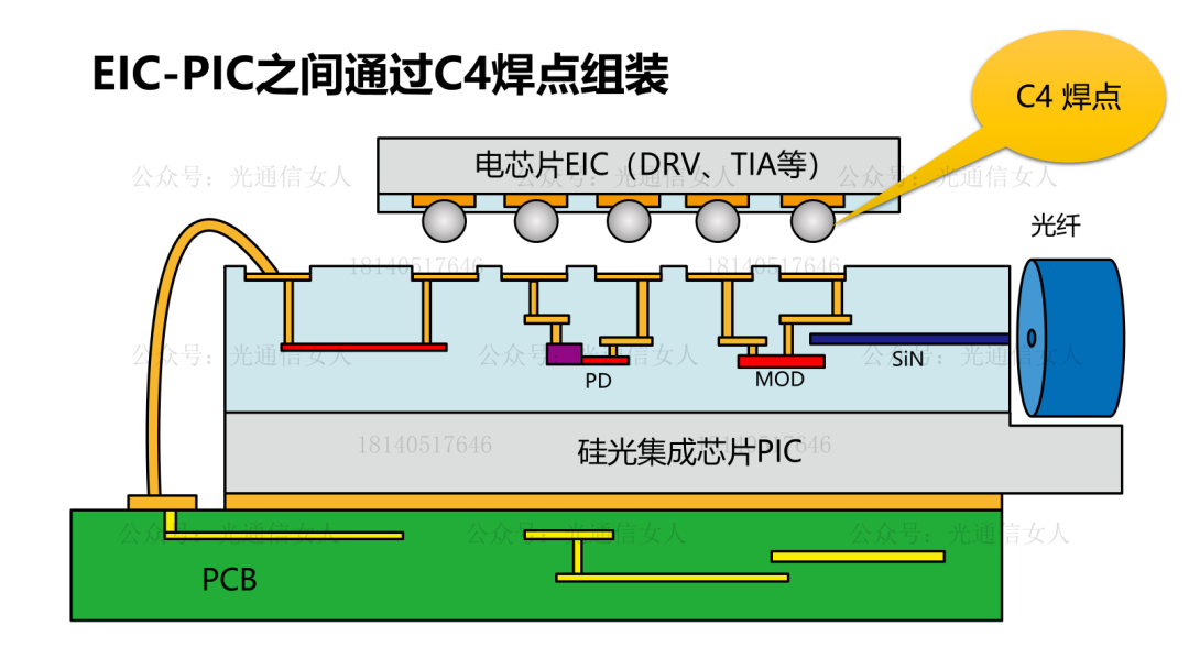 现在的硅光芯片3D封装,电芯片EIC与硅光芯片PIC“叠摞”焊接,C4凸点、铜柱C2凸点或者是混合键合,UCdavis大学做了焊点工艺与寄生参数的分析,以及与灵敏度的关系。之前他家就分析这些内容,Y9T161 硅光芯片与电芯片采用DBI或C4高密度大带宽互联可以通过C4焊点来连接EIC与PIC,焊点间距在150-200μm,硅光芯片与PCB可以采用键合金丝互联。一个立体示意图如下所以,EIC与PI